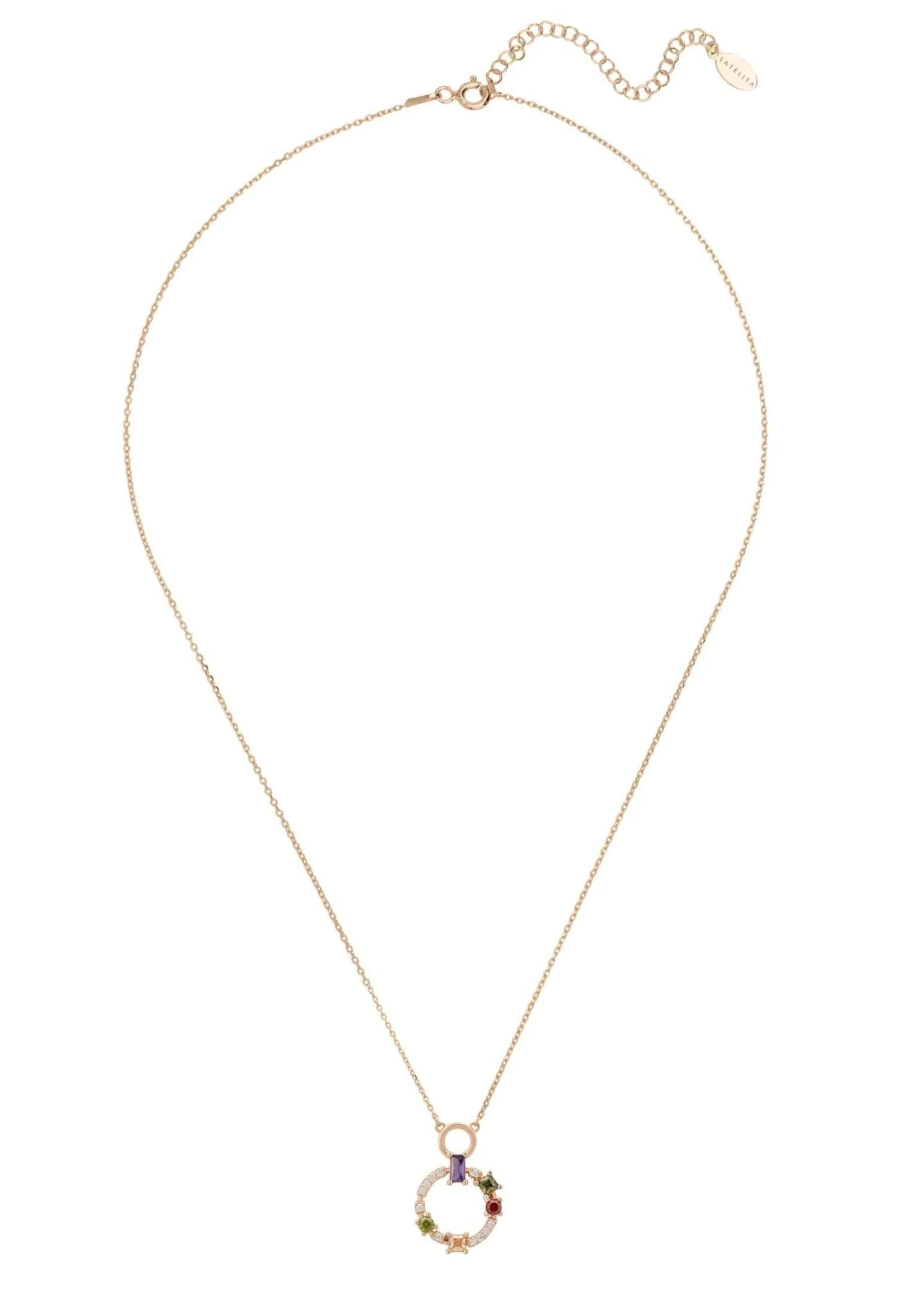 The Amalfi baguette halo necklace features a halo with colourful baguette cut gemstones scattered around its circumference with white zirconia in-between so that the entire halo is edge with gemstones. The largest rectangular cut baguette sits prettily at the top just beneath a smaller metallic halo where the chain is attached.