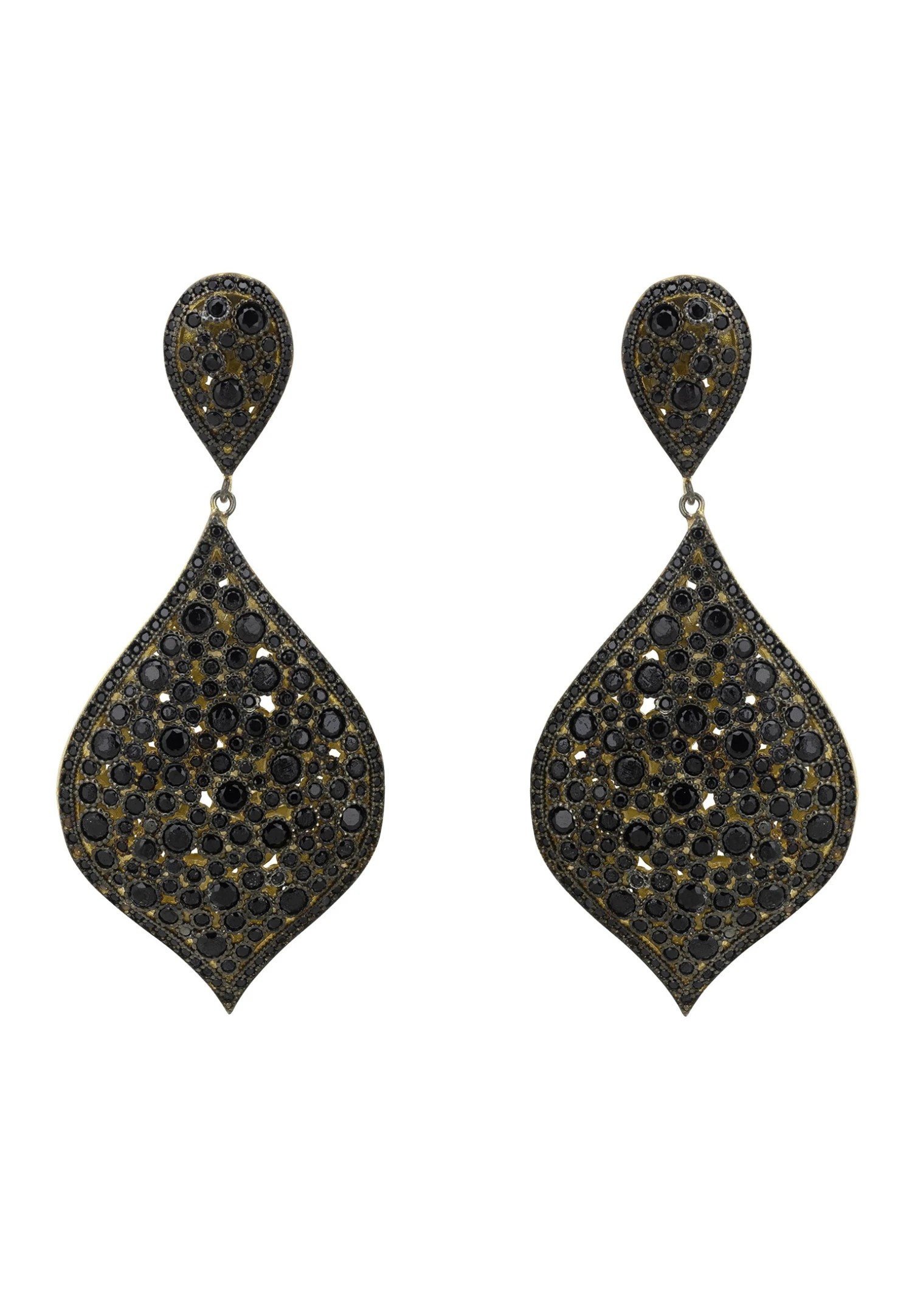 Made from 925 sterling silver and dipped in 18ct gold, they promise durability and a lasting shine. These earrings dazzle with sparkling black crystals of various sizes, meticulously placed along the bevelled drop. This design element not only adds a layer of sophistication but also ensures an enchanting sparkle with every turn. Attached to this mesmerizing drop is a smaller, similarly shaped top, providing fluid movement and an extra glimmer as they play with the light. What sets these earrings apart is the attention to detail, evident even on the back. Adorned with arabesque engraving on the metallic setting, they ensure allure from every angle, making them perfect for hairstyles that show off the ears.