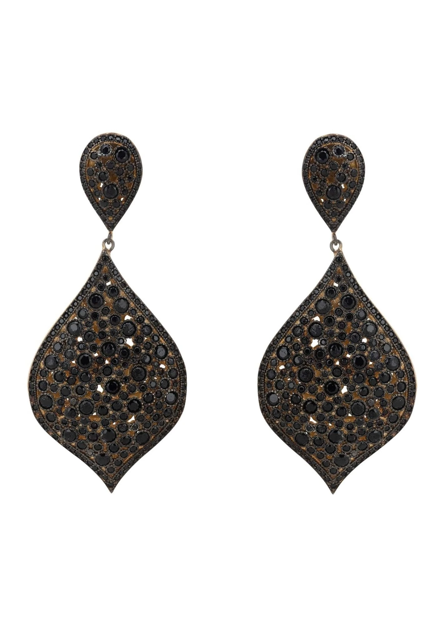 The beautiful shaping of this stunning earring takes inspiration from the domed rooftops of the majestic Taj mahal towers. Sparkling black crystals, in differing sizes, adorn the bevelled drop of this earring which is linked to a smaller replica shaped top which allows for extra movement and added sparkle as they catch the light.