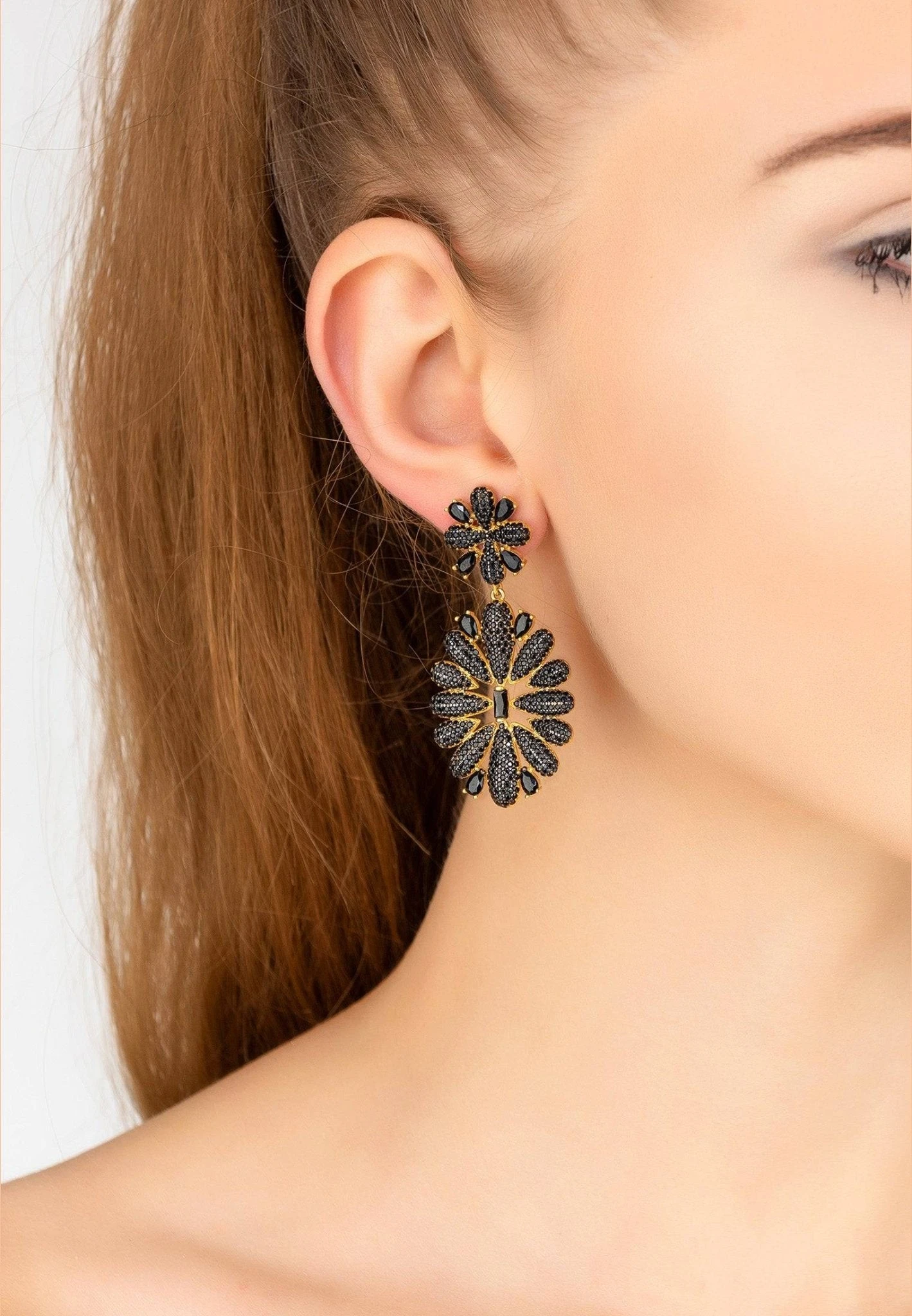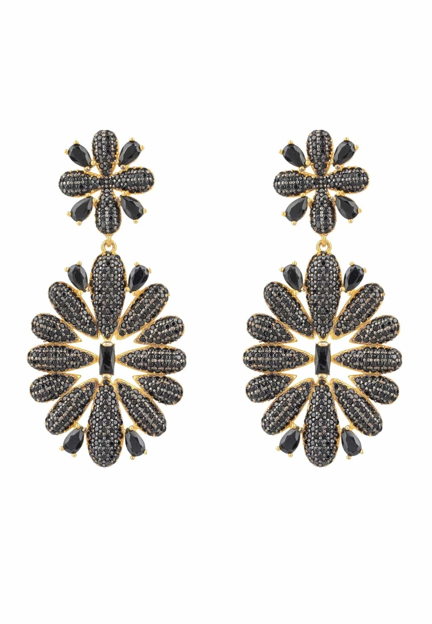 Inspired by the fabled gardens of Babylon, these stunning earrings dazzle with the luxurious black zircons and gemstones, beautifully set within an elongated flower shaped design with a black gemstone at its centre, suspended from a smaller gem encrusted flower design top. Which creates added movement for the wearer.