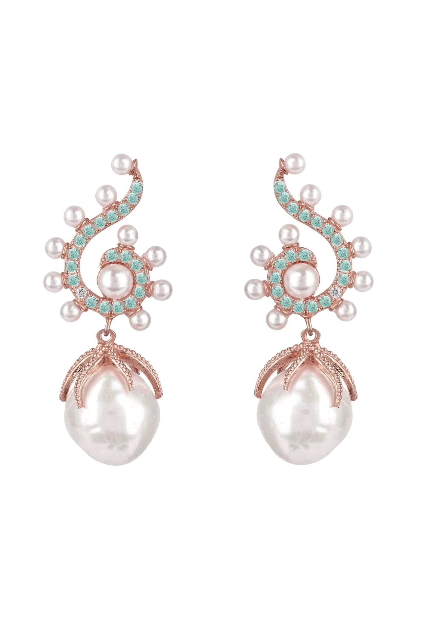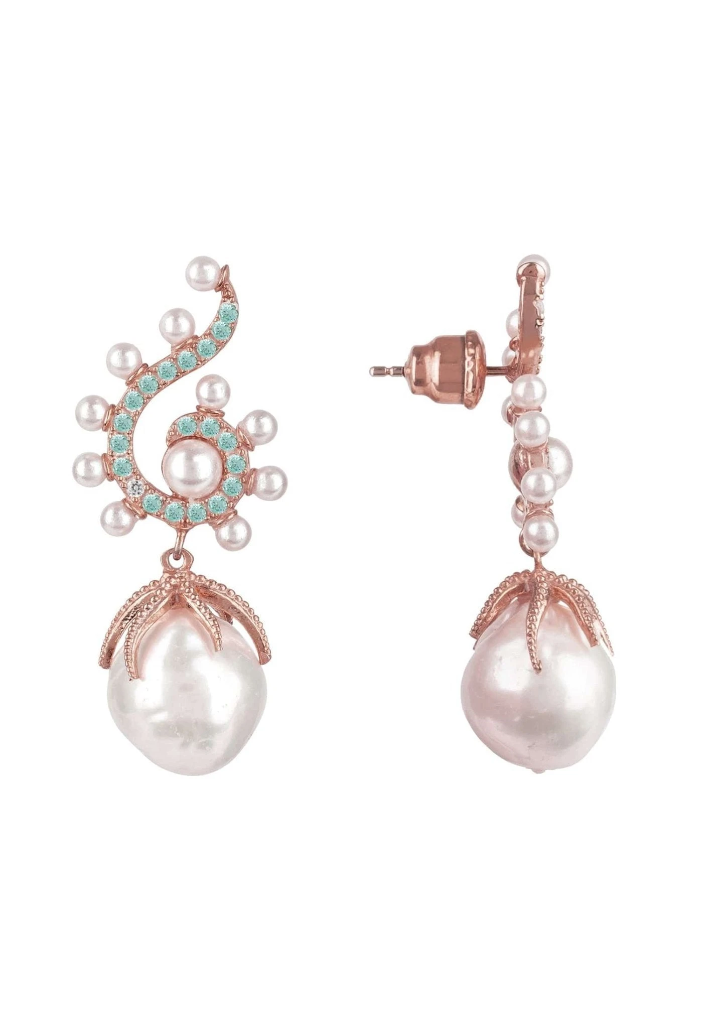 Add some iridescent magic to your wardrobe with our Baroque Pearl Poseidon Gemstone Drop Earrings! Our designer earrings feature a heavenly swirl design crafted from 925 sterling silver that has been dipped in rosegold. Sparkling aqua cubic zirconia follow the line of the swirl and its outer edge is dotted with small round pearls. The drop portion of the design is adorned with beautiful baroque pearls that have an organic and irregular shape, perfect for any fashionista who wants an accessory that is as unique as you are.