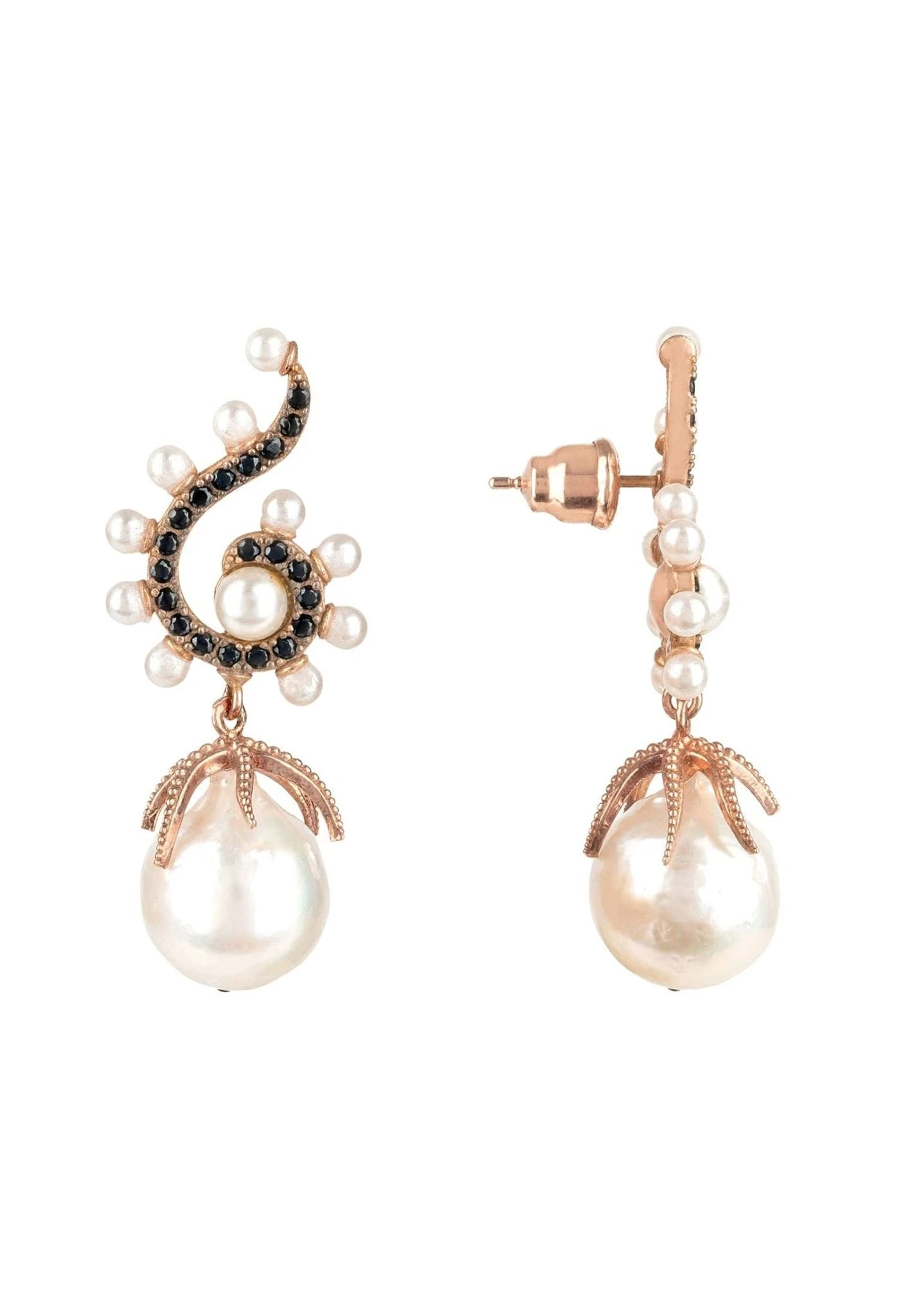 925 sterling silver, dipped in 22ct rosegold. AAA grade black cubic zirconia. Pearls, Baroque pearls.