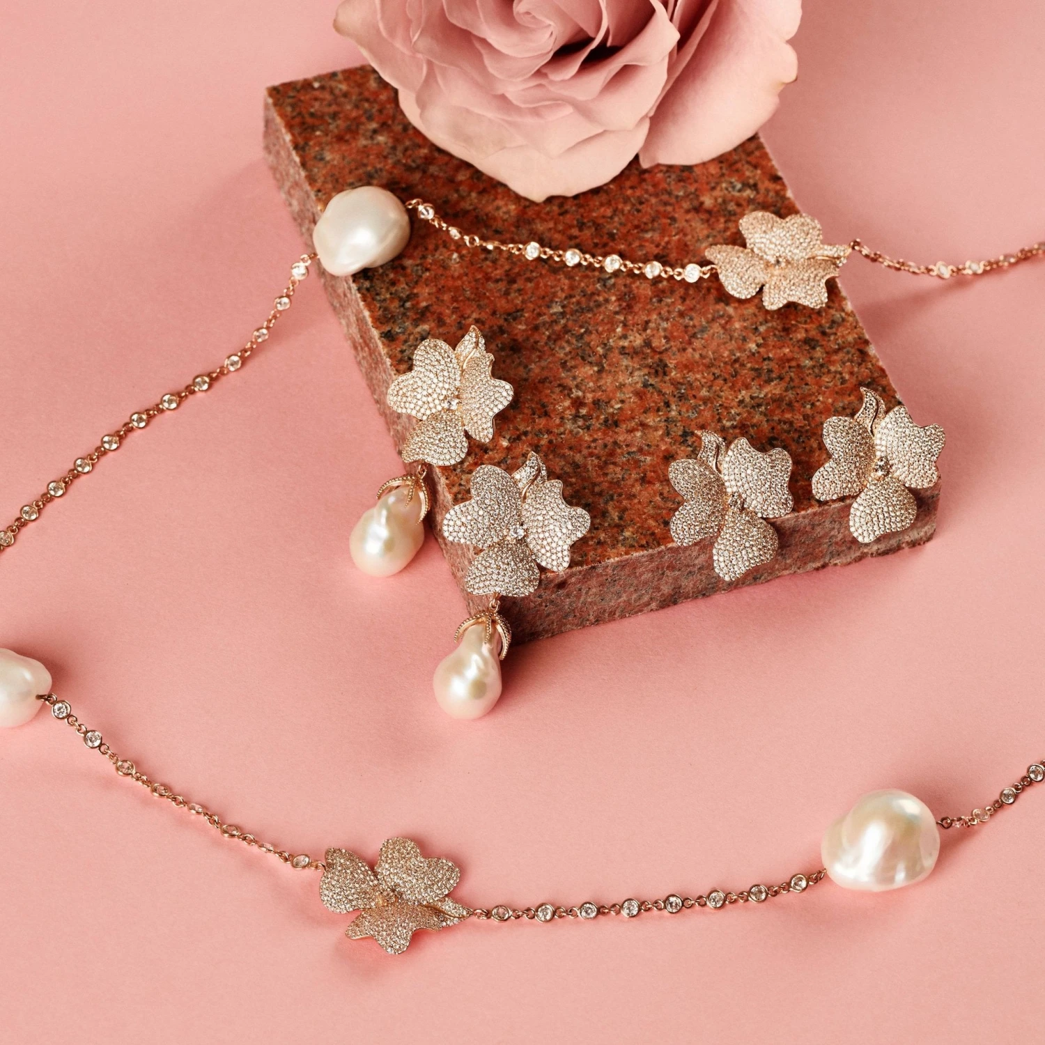 Introducing the Baroque Pearl White Flower Drop Earrings, a stunning accessory that’s perfect for special occasions. These earrings feature beautiful floral tops adorned with sparkling cubic zirconia and suspended baroque pearls. The pearls are naturally formed with organic and irregular shapes, making each pair unique. They’re also pierced earrings with post backs and butterfly fastenings. Made from 925 sterling silver dipped in 22ct rosegold, with a length of 5.5cm, width 3cm, and weigh approximately 26g.