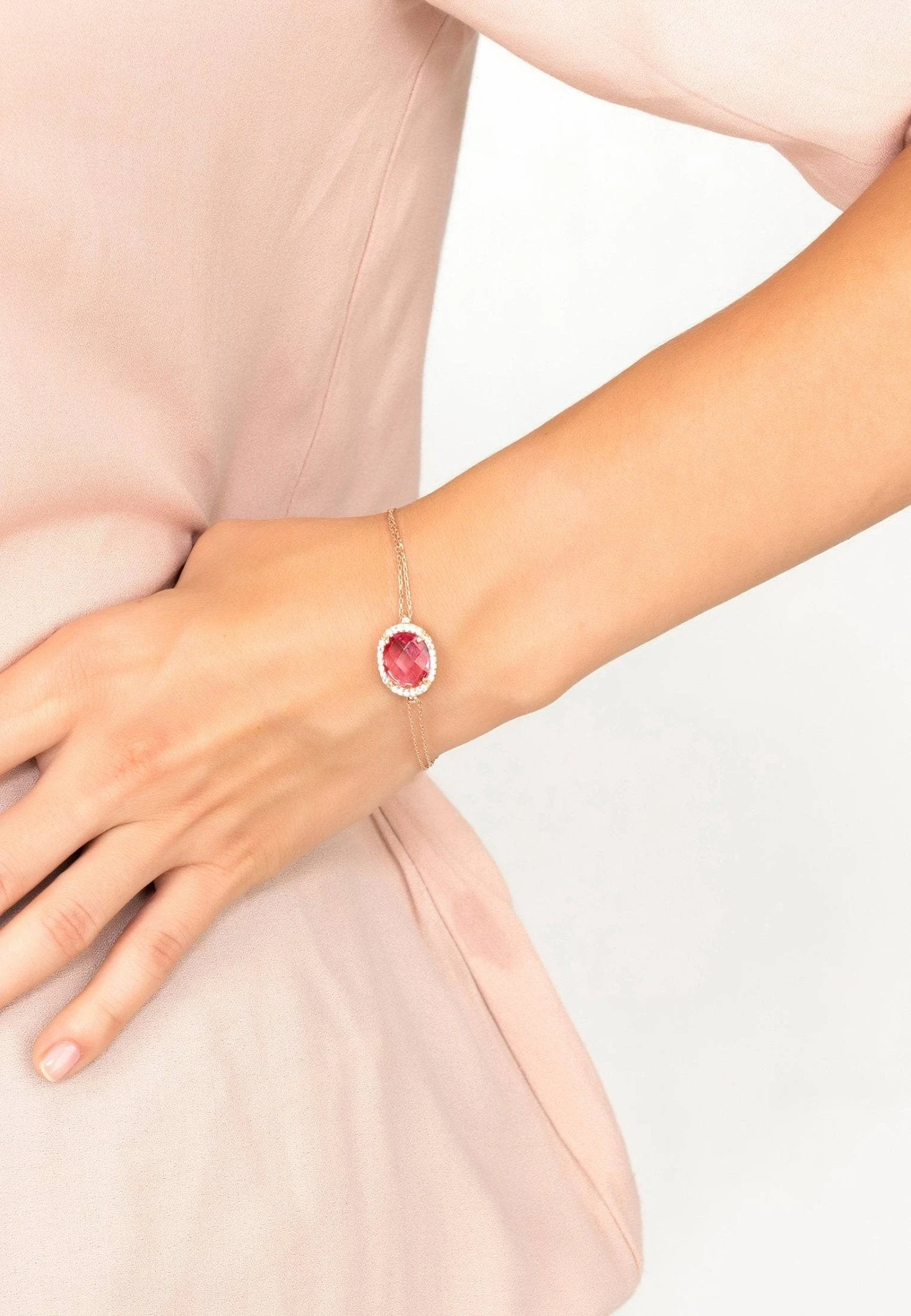 Step out in luxurious style with the beautiful Beatrice Oval Gemstone Bracelet, intricately crafted and unique enough to capture every eye that dares look upon it. Featuring a multifaceted oval gemstone surrounded by gleaming cubic zirconia, this piece never fails to please – beautifully reflecting the light from day to night. Its deluxe-style double chain is ideal for your finest evening outfits and will help to light up any party. If you’re looking for a luxurious accessory that you can flaunt from event to event, then look no further than the exquisite Beatrice Oval Gemstone Bracelet.