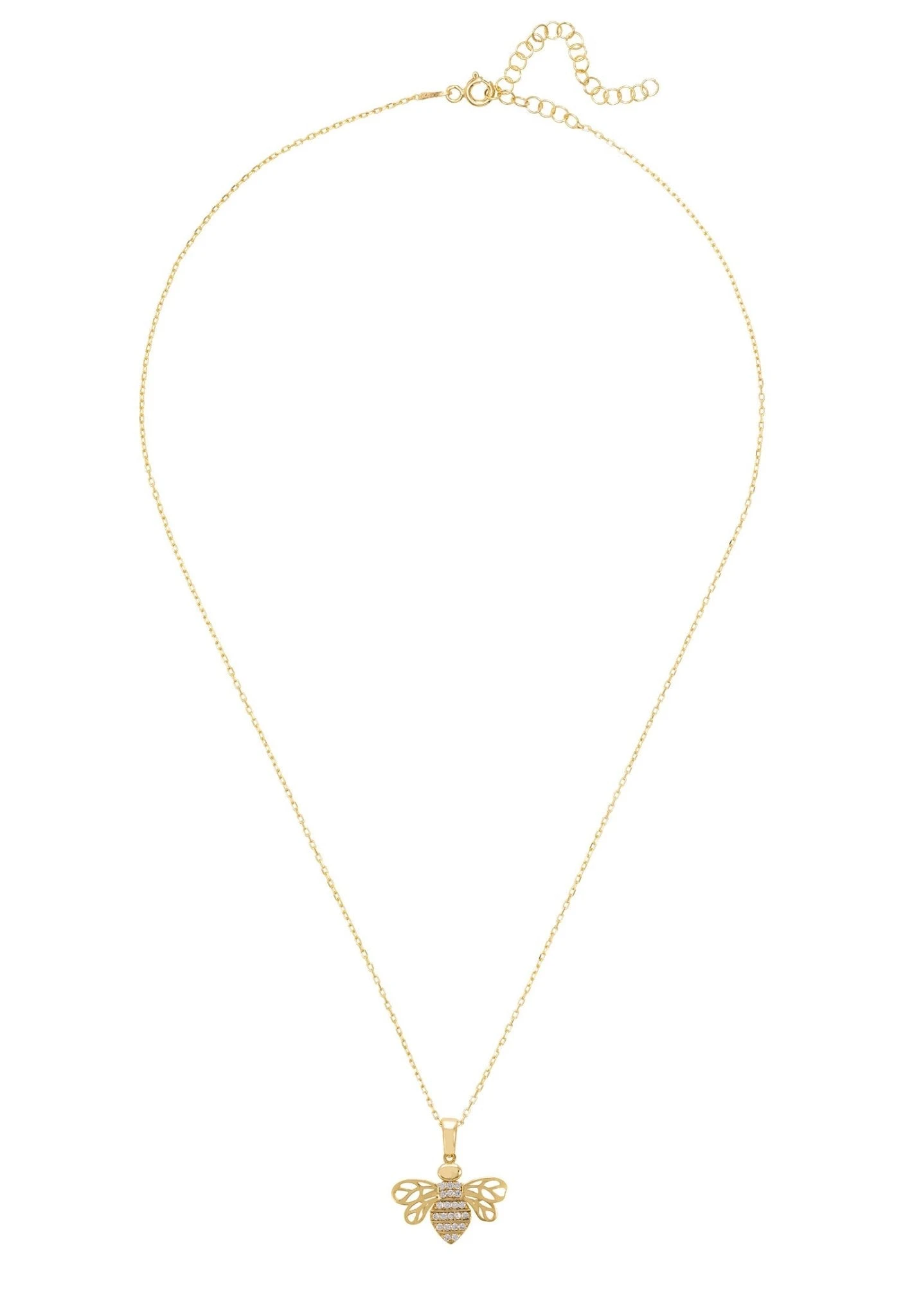 The pendant comes on a 39-44cm rolo chain with size adjuster, the bee motif measures 2cm wide x 1.5cm and and the whole piece is 2.5 grams in weight.