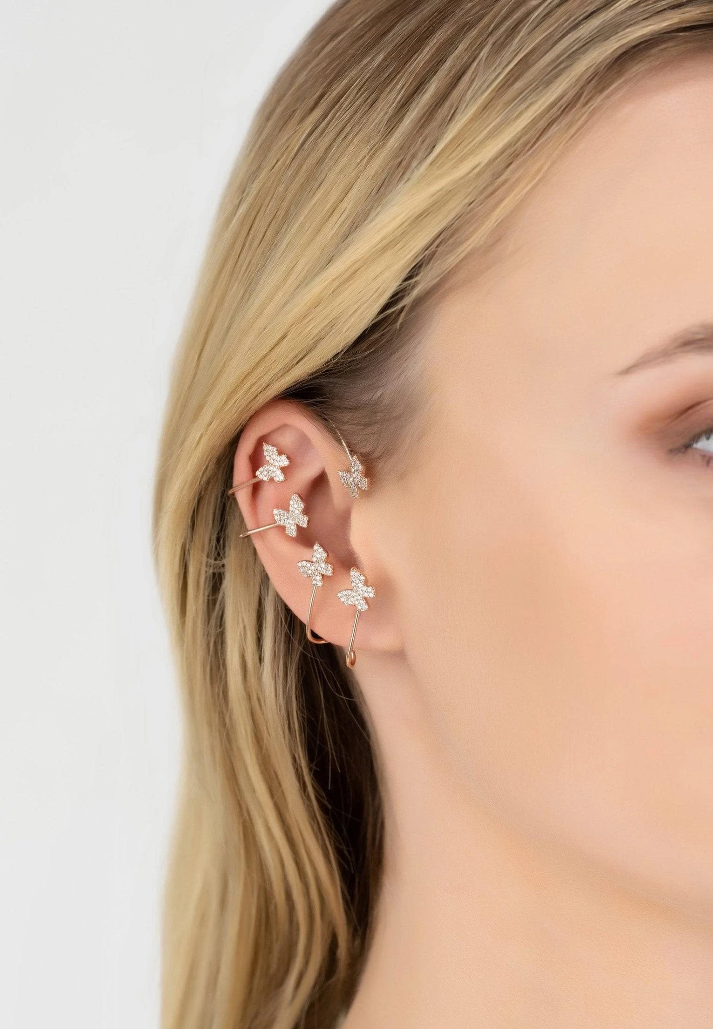 Worn so that the butterflies appear to have taken flight and landed beautifully on the ear. The five butterflies are adorned with sparkling zirconia.