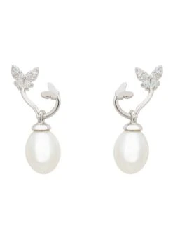 These delicate earrings feature two dainty butterflies joined in flight by a fine metallic strand which supports a small suspended pearl which dangles daintily beneath. One butterfly is decorated with sparkling zircon the other is left to a highly polished metallic finish.
