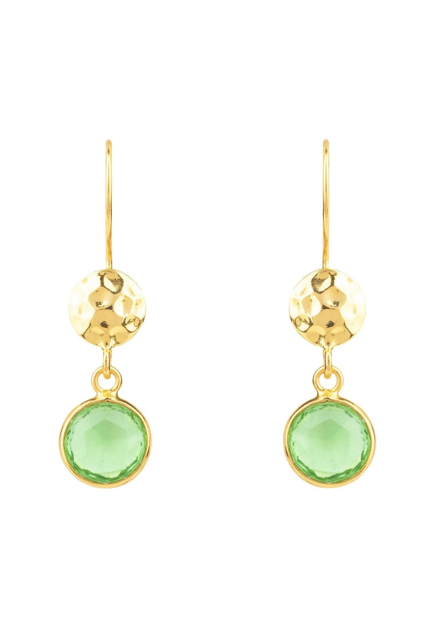 Featuring a hand hammered metallic disc and a faceted semi precious natural stone, on a fixed french hook.