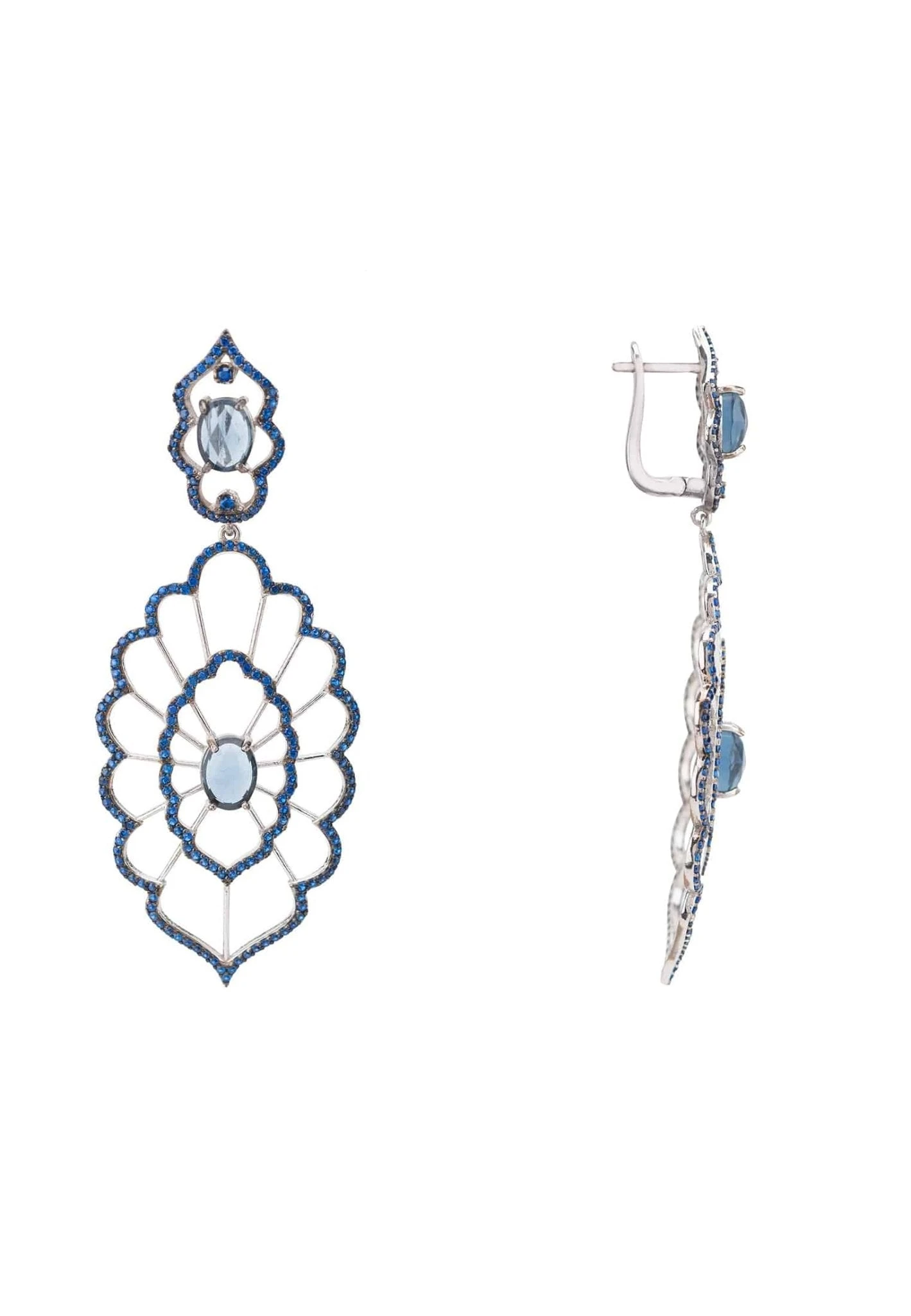 This open cut floral inspired dangle and drop earringĀ is completely covered in sparkling micro zircons,Ā beautifully set within an elongated flower shaped design. For extra sparkle, theĀ fluted outer edge is accentuated with more zircons finishing with a single cabochon at its centre,Ā suspended from a smaller, open design, floral shaped creole top edged with zircons encasing a secondĀ cabochon.Ā