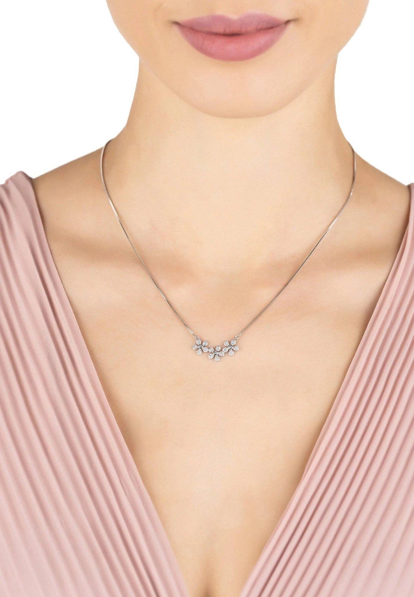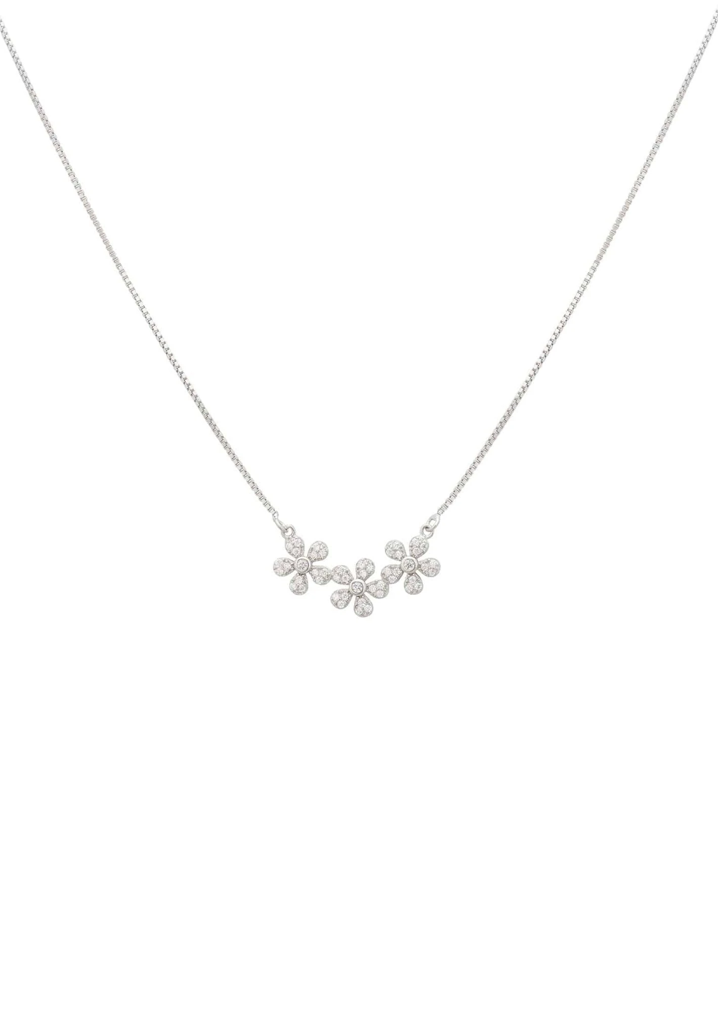Let this Daisy chain necklace be your new wardrobe staple. This gemstone necklace features a box style chain attached to both sides of a fixed floral inspired motif consisting of three flowers adorned with white zirconia. This chic necklace will add glitz and glam to any outfit.