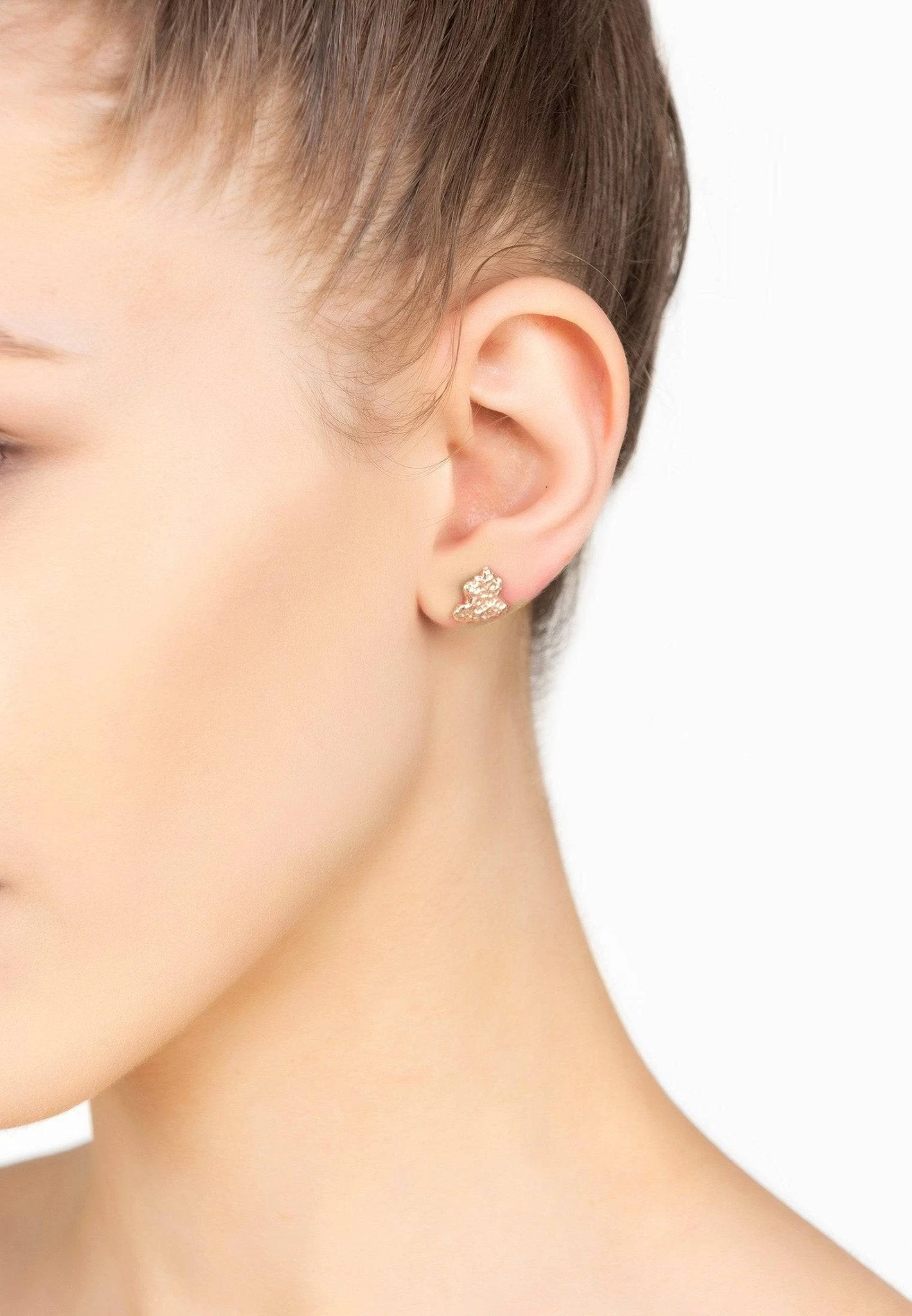 The versatility of this stunning earring allows for it to be worn two ways. Wear in its full glory with zircons adorning the art deco design fan jacket, that sparkle as they catch the light with their natural movement, or as a simple but beautiful organic shaped metallic stud.