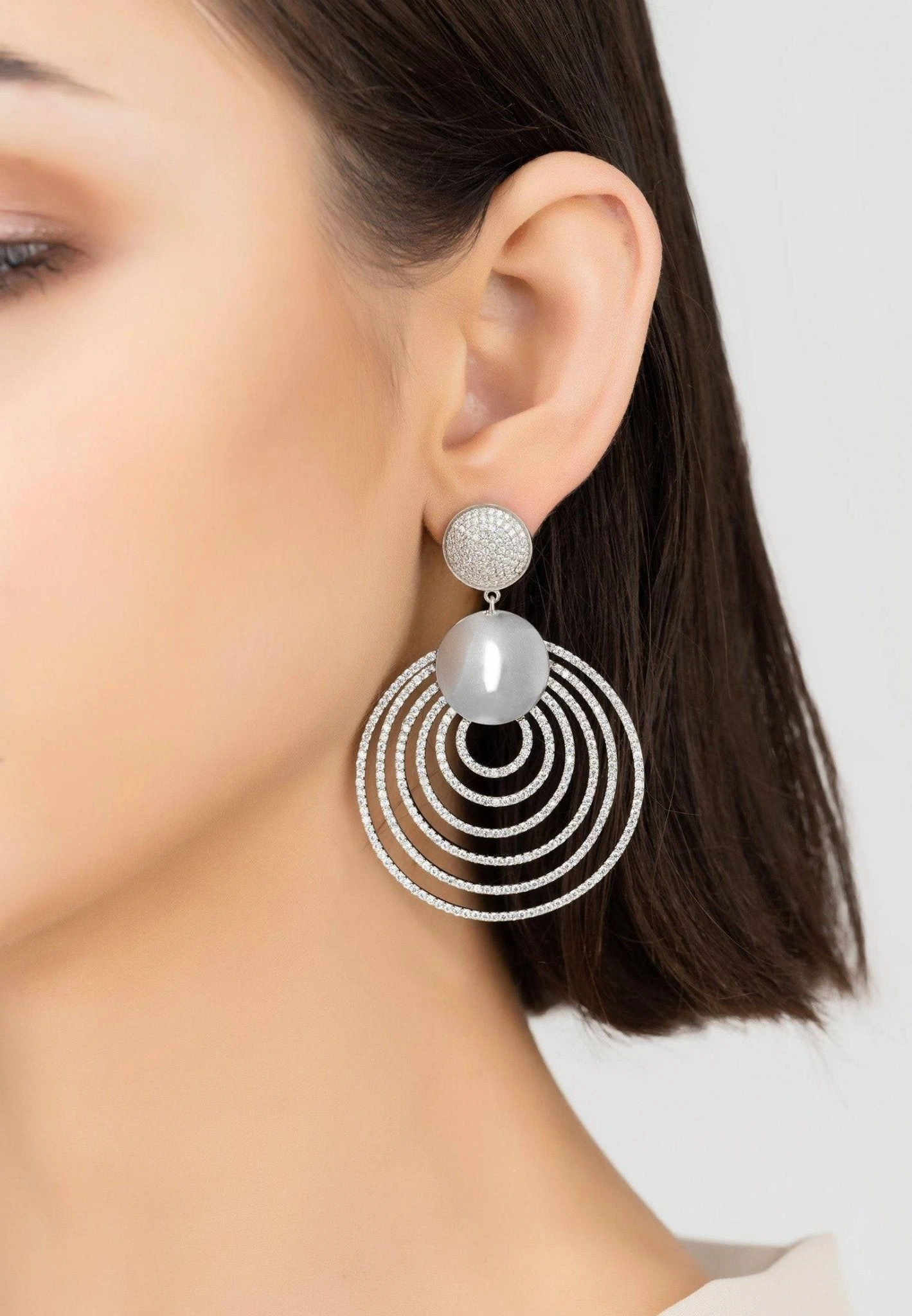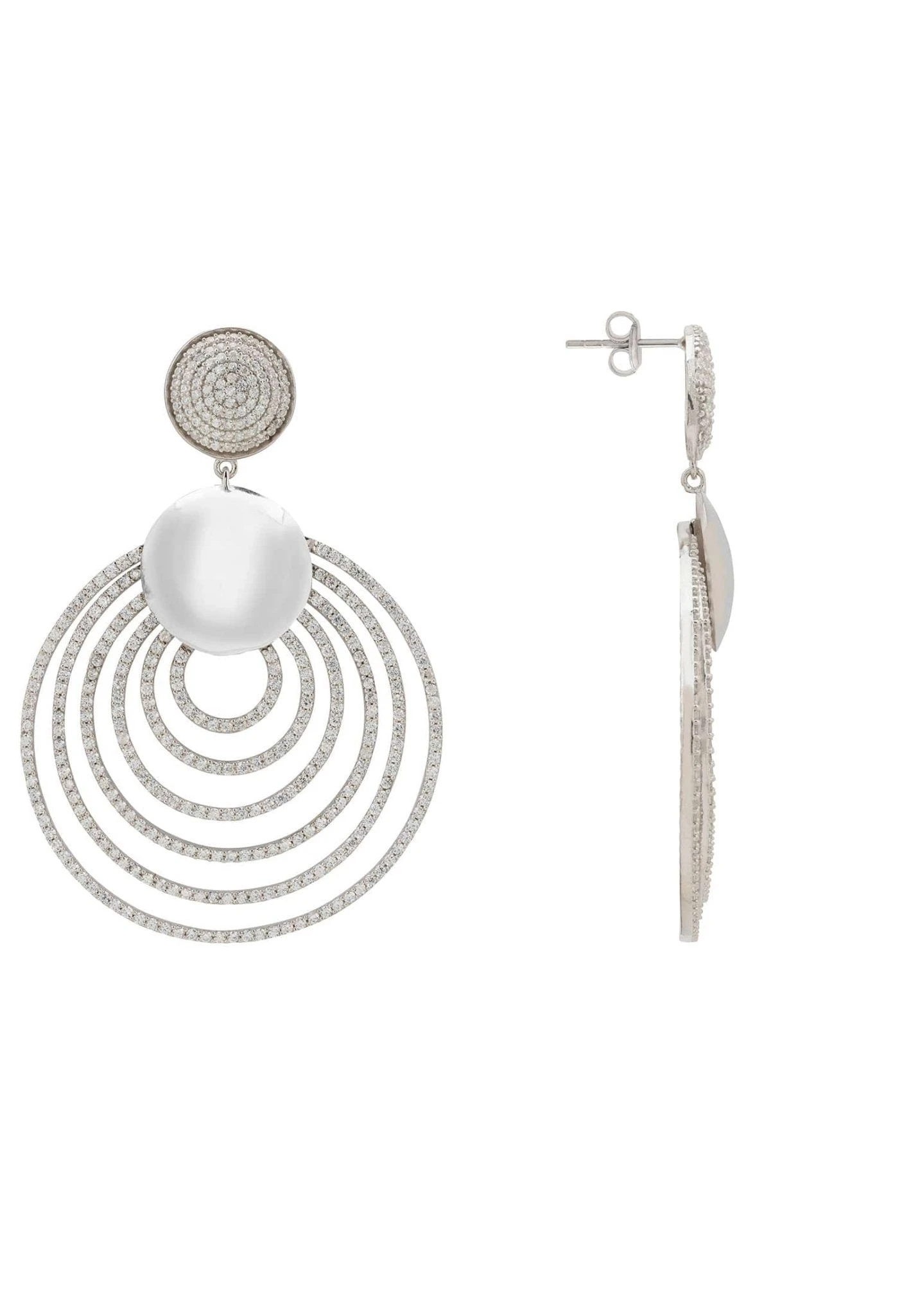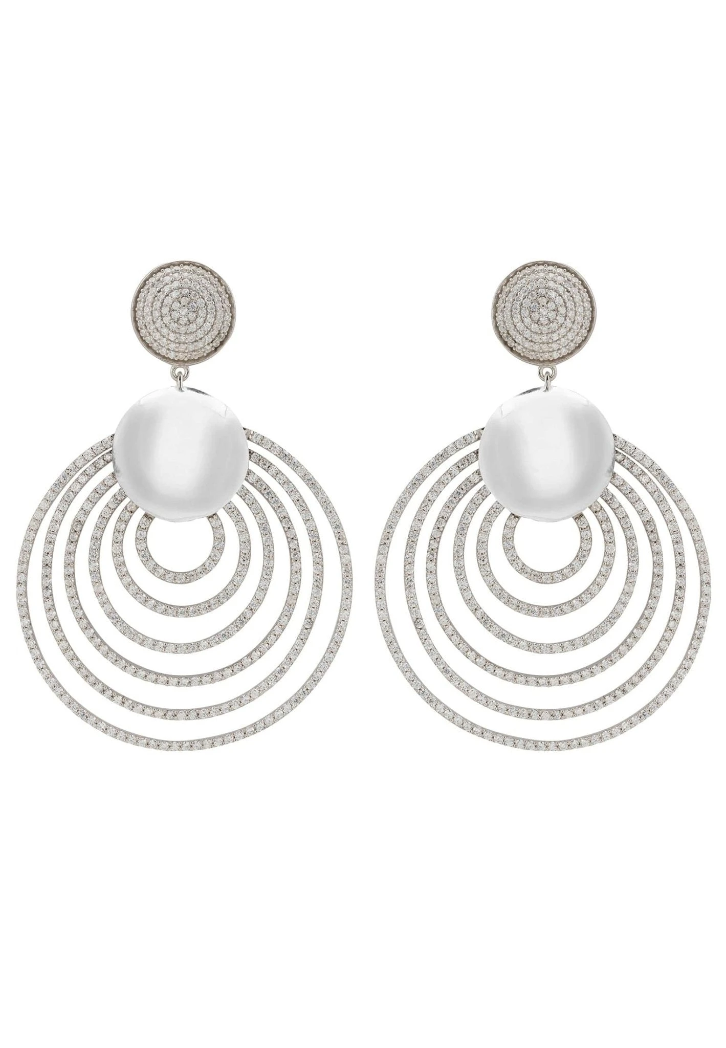 These elegant earrings appears as if staring into a vortex creating a hypnotic effect of ever decreasing circles of sparkling cubic zirconia that seem to disappear behind a highly polished metallic disc, suspended from a zircon adorned top.