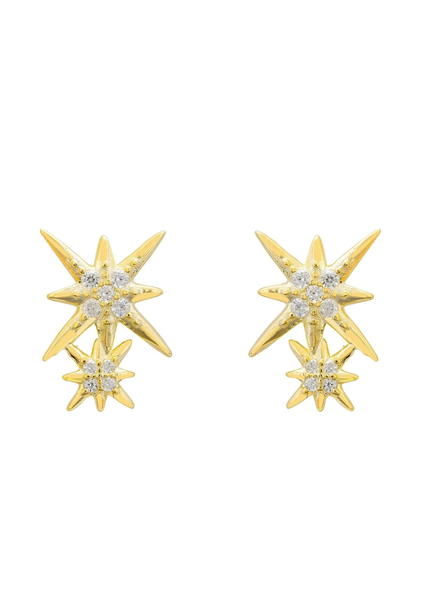 Handcrafted with 925 sterling silver dipped in luxurious 18ct gold, each eye-catching pair boasts two different sized stars whose surfaces are lavishly adorned with dazzling cubic zirconia.