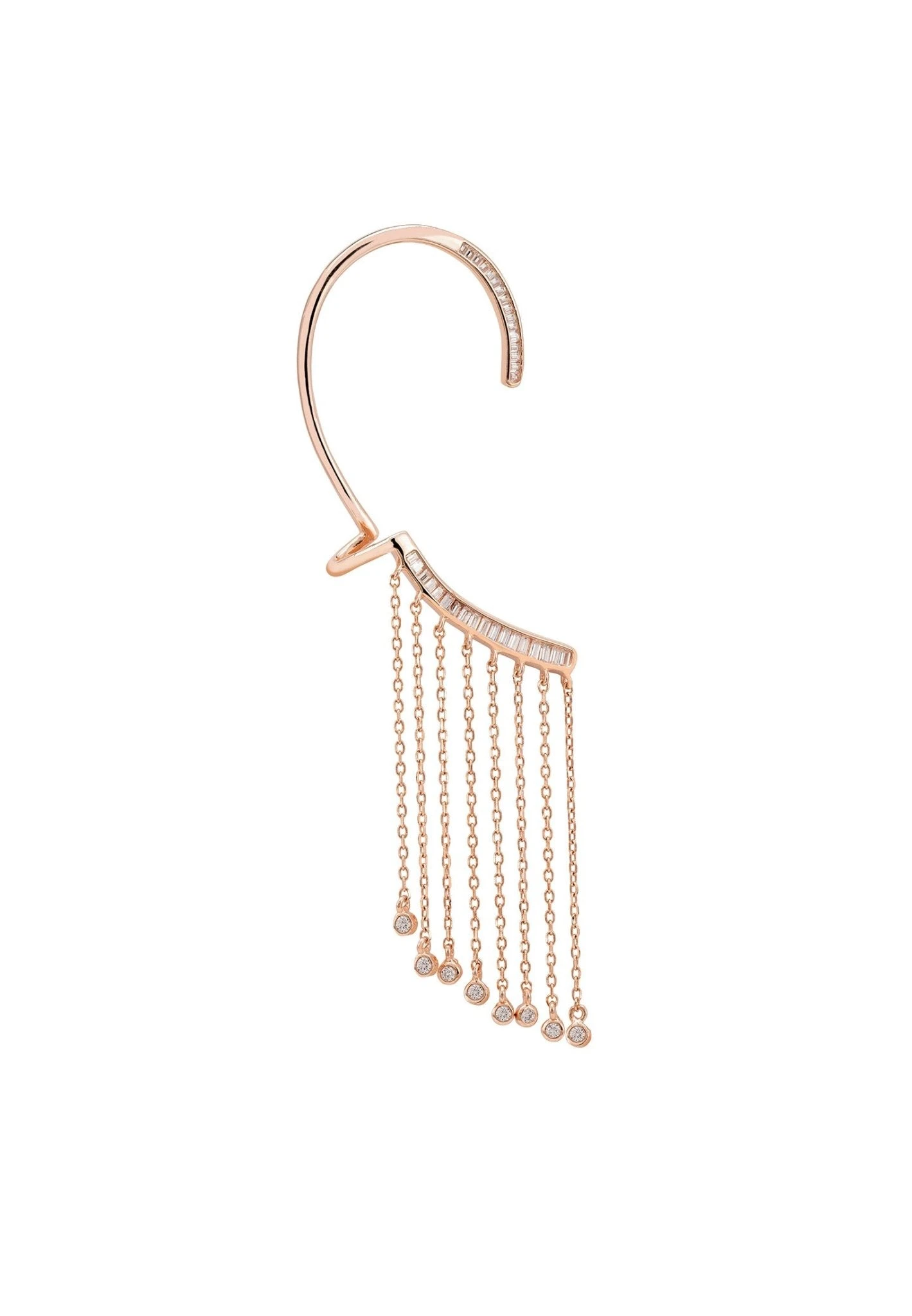 This gorgeous ear climber is handcrafted from 925 sterling silver and has been dipped in 22ct rosegold. This ear climber has been adorned with baguette cut cubic zirconia on both the top arc and the lower part, giving it a touch of luxury, it also comes with eight chain strands that dangle down below the ear lobe, each with a single zircon at its tip.