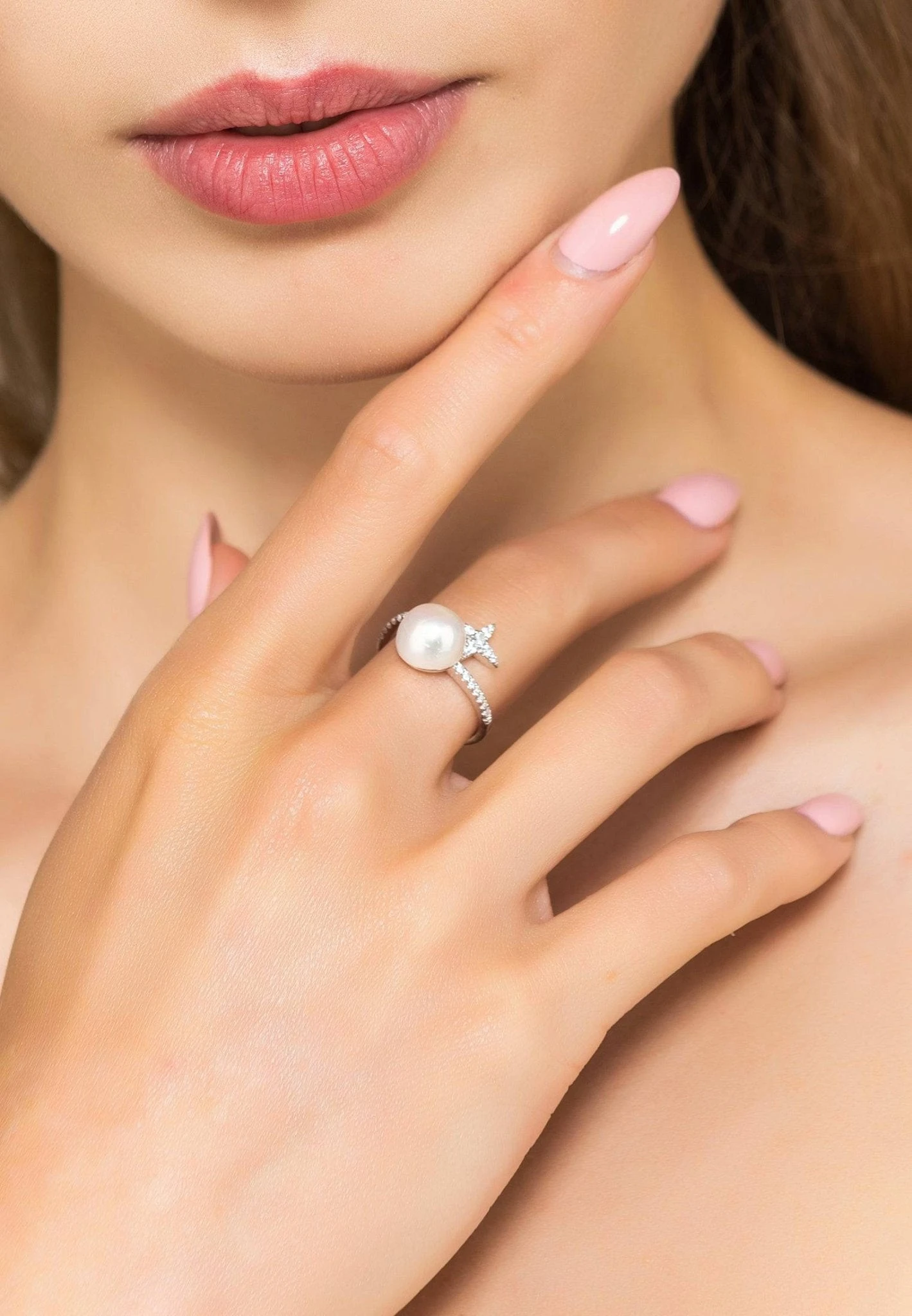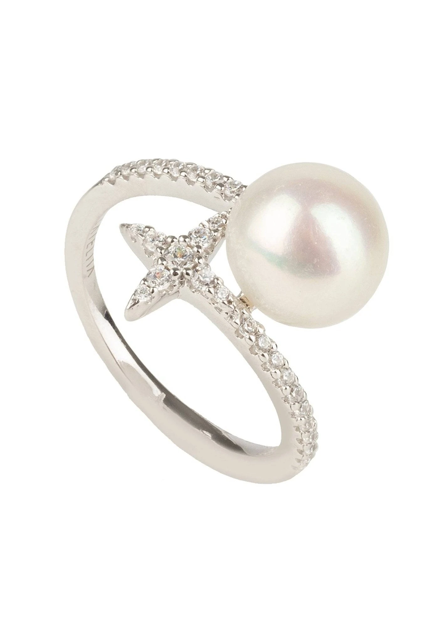 Great for everyday styling this 925 sterling silver ring features white zircons along the band of the ring, leading to a small star and white pearl at its top.