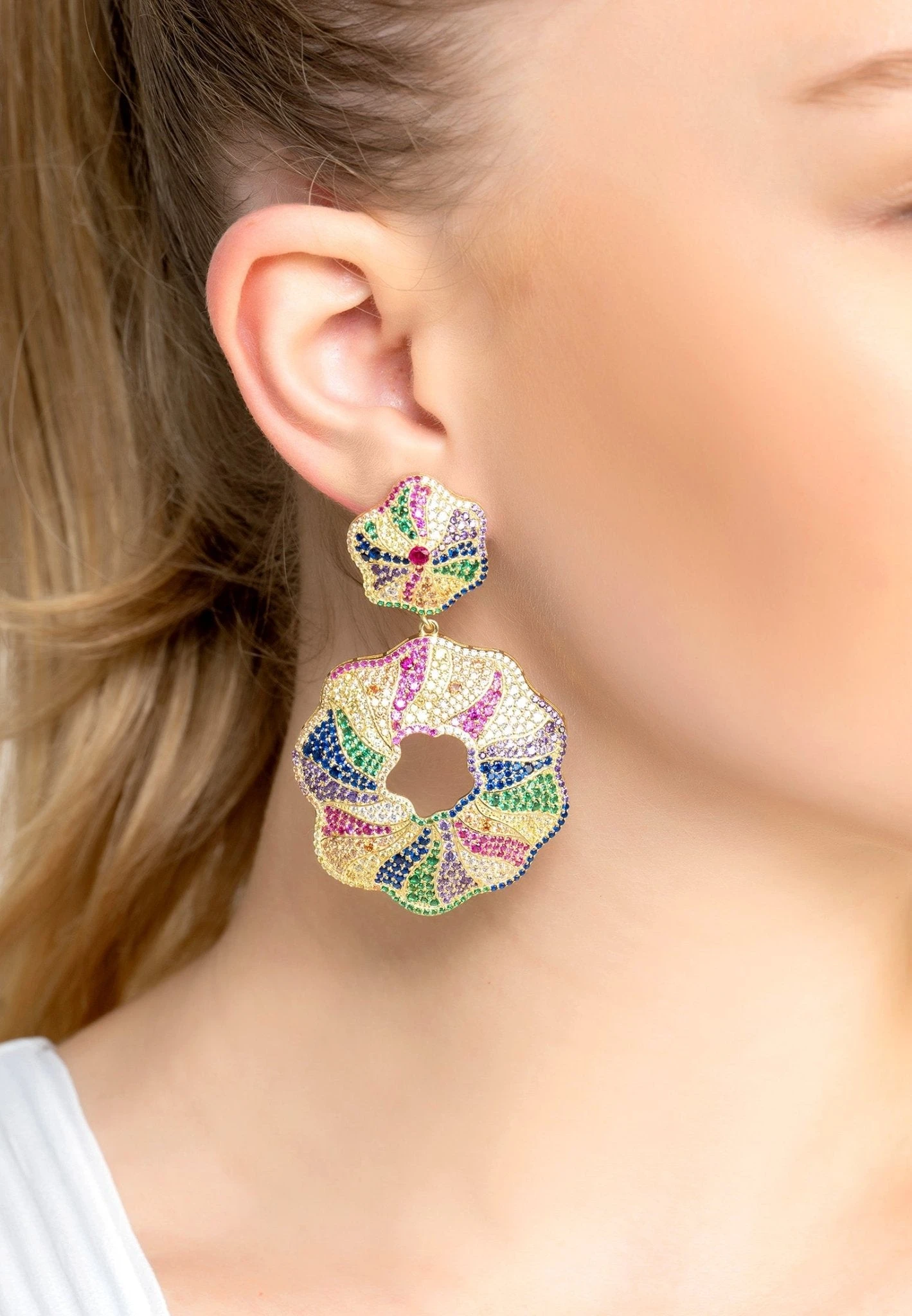 These stunning statement earrings offer a unique style, each earring features two organic shaped discs of differing sizes. At the top of the earring there is a small disc complete with a stud post back. The larger disc is suspended from this using a small metallic link, to allow for natural movement of the earrings when worn. For added detail the larger disc has an open centre. To complete the look these earrings are adorned with an array of colourful zirconia set in a rainbow effect. These are a chunky yet lightweight design that reflects the latest fashion trends.