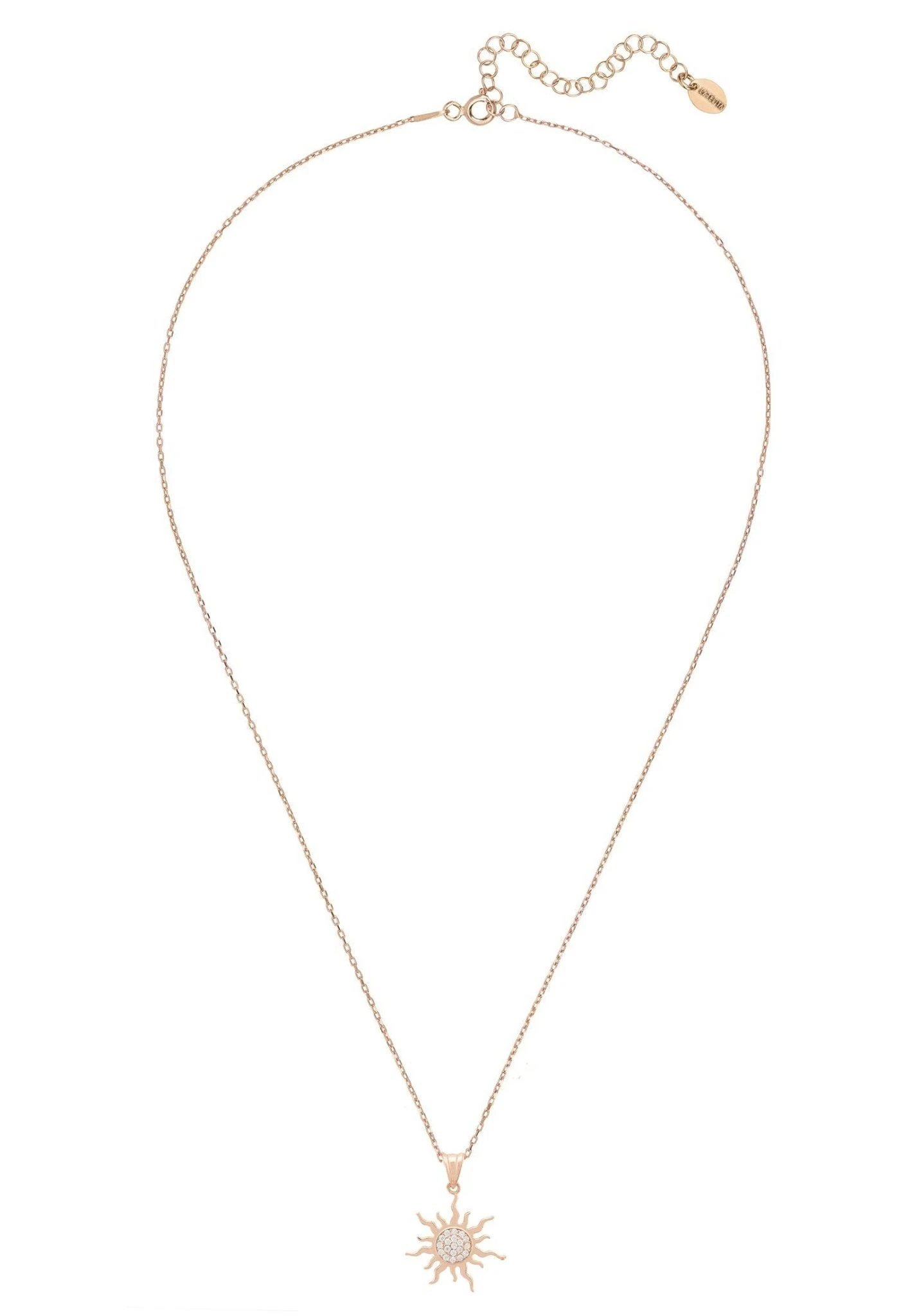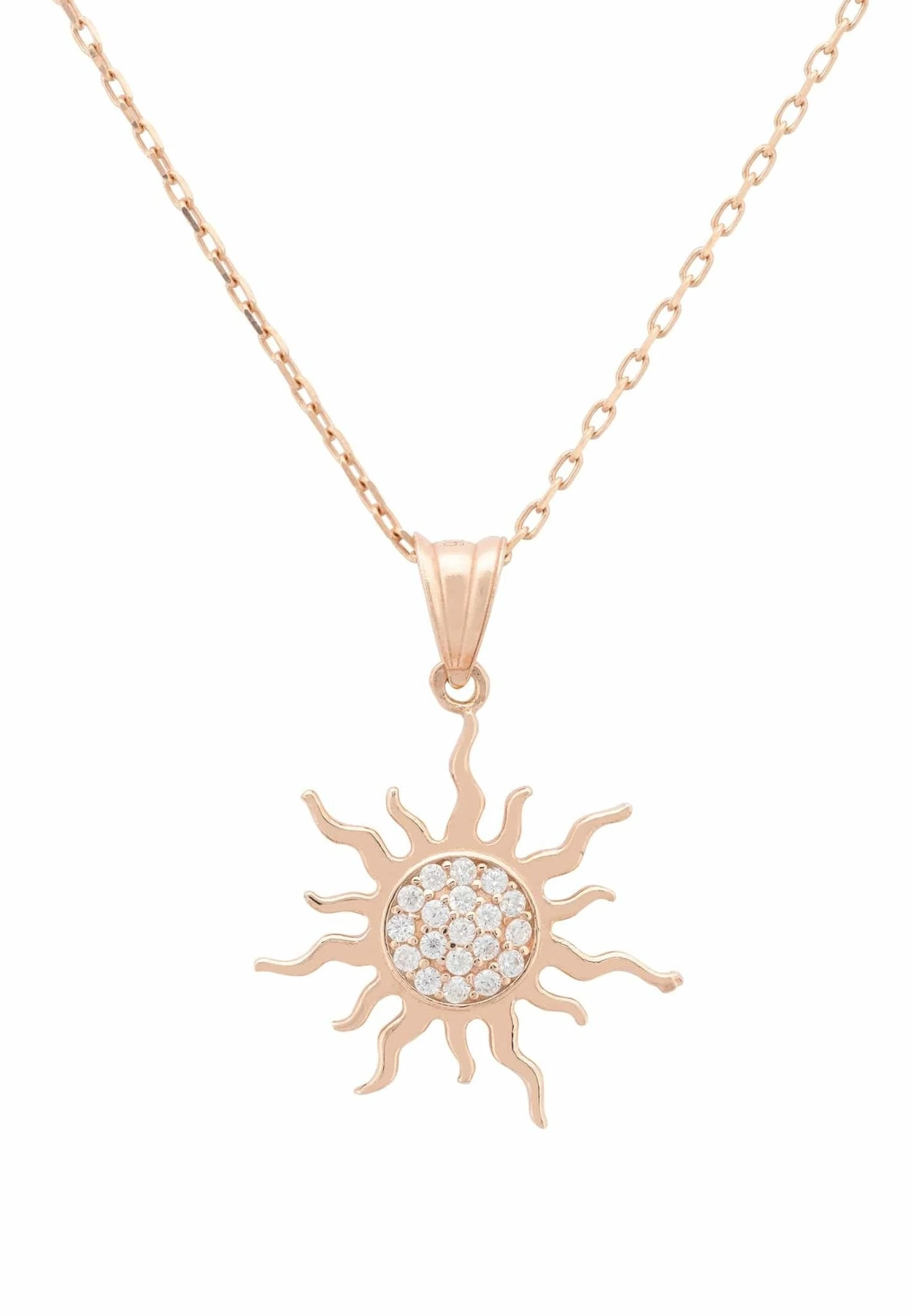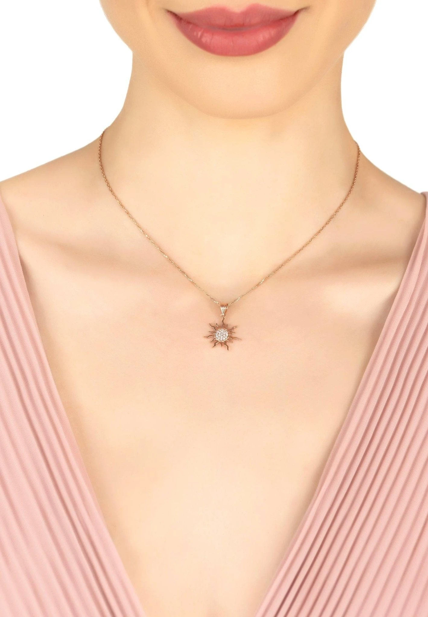 The pretty sun motif is decorated with white zirconia at its centre, the suns rays are left to a highly polished metallic finish, all suspended on a fine chain from a metallic bail.