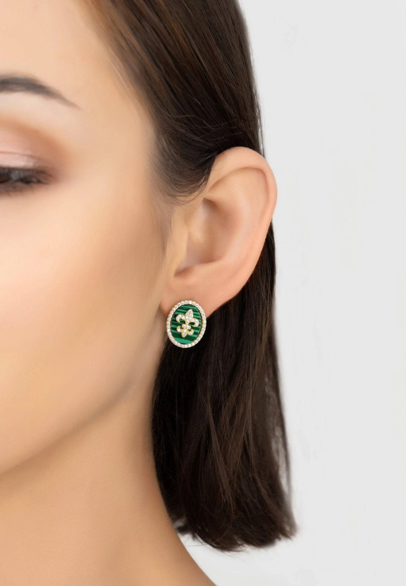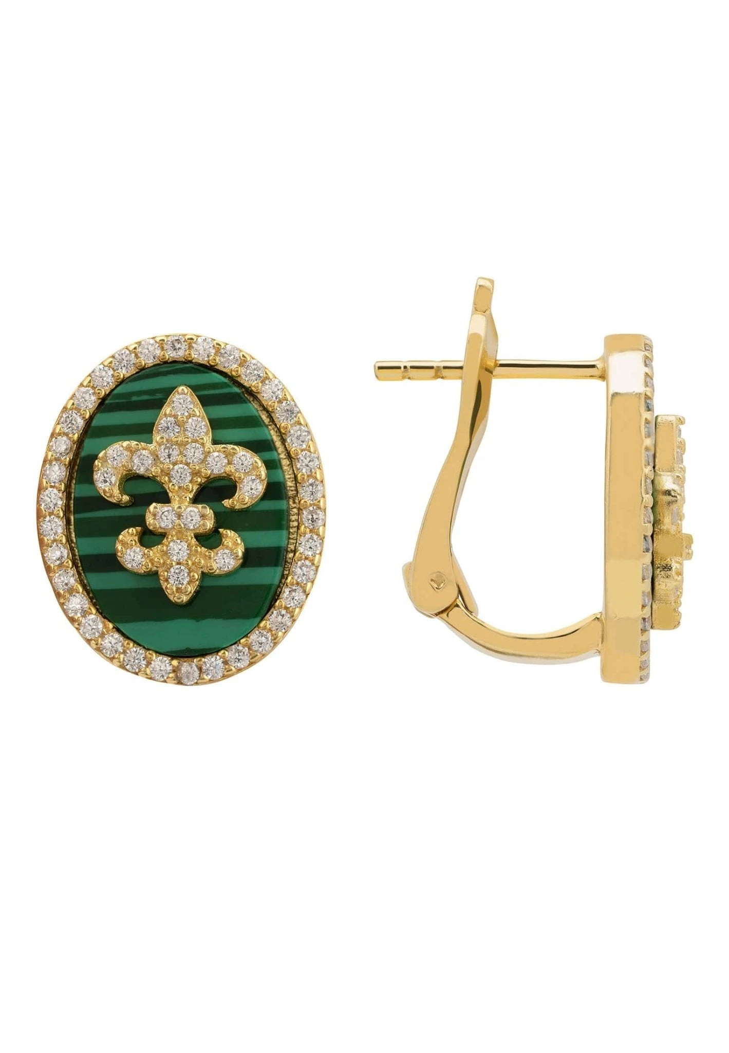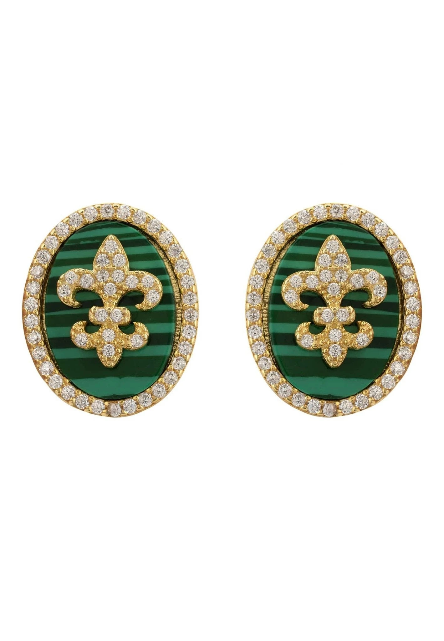 Great for everyday styling these oval stud earrings feature the fleur de lys adorned with zircons on a slice of Malachite. For added sparkle these earrings are also outlined with fine white zircons.