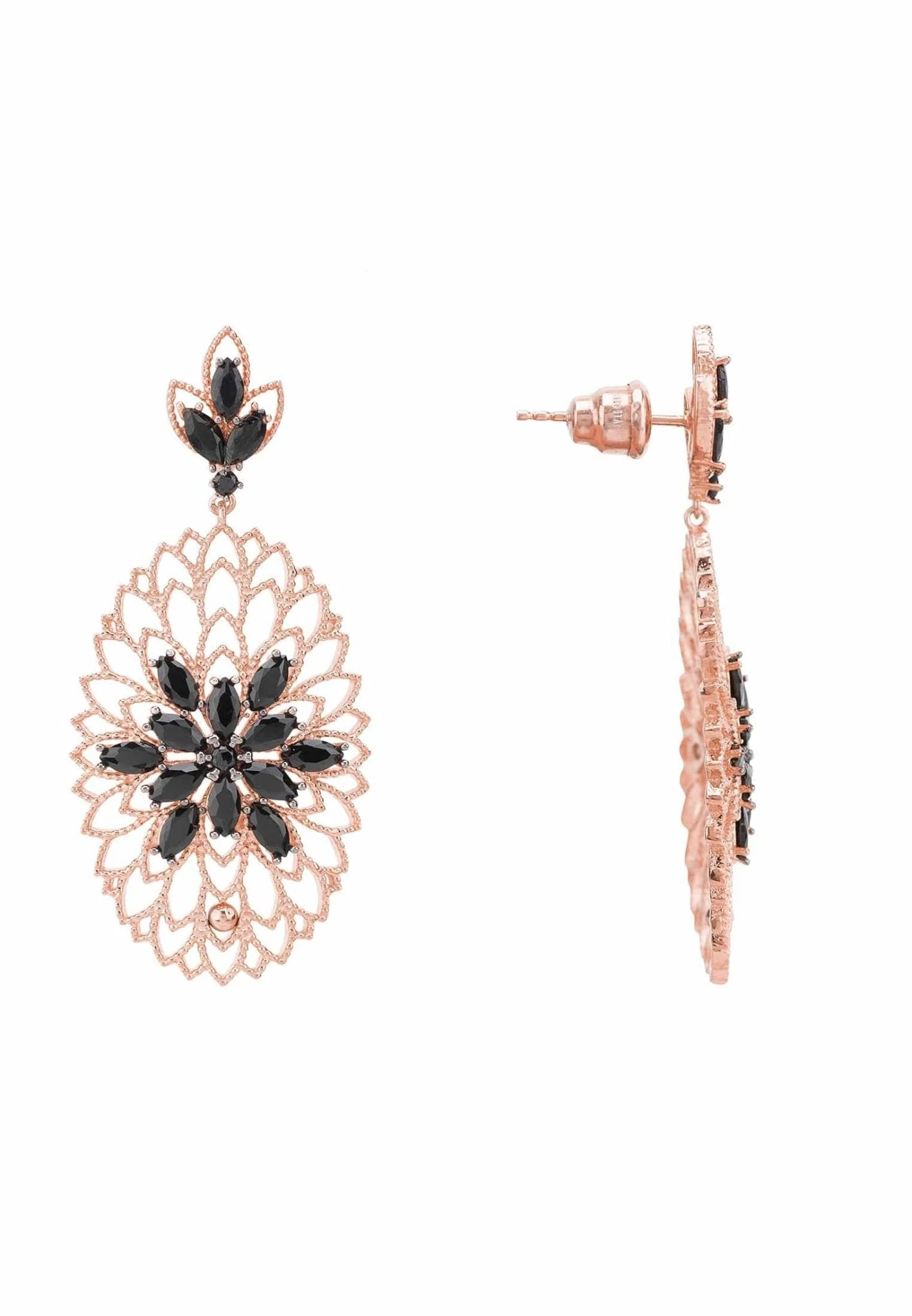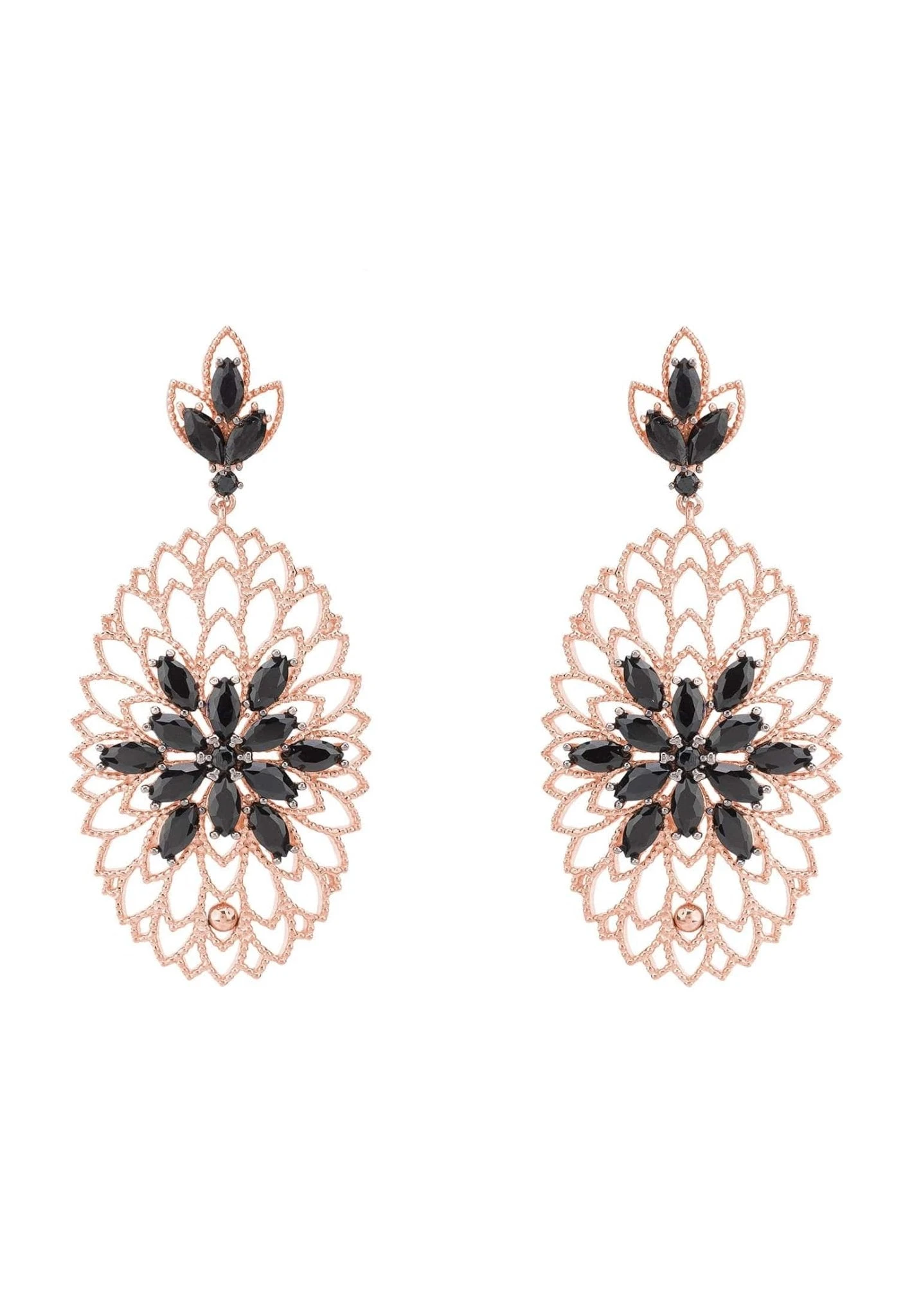 The full bloom flower earrings dazzle with sparkling cubic zirconia in the design of a flower, beautifully set at the centre of an intricate design of filigree, as fine as if spun by a spider. These oval shaped drop earrings are topped with a gemstone adorned stud post in a leaf design attached by a link to allow natural movement.
