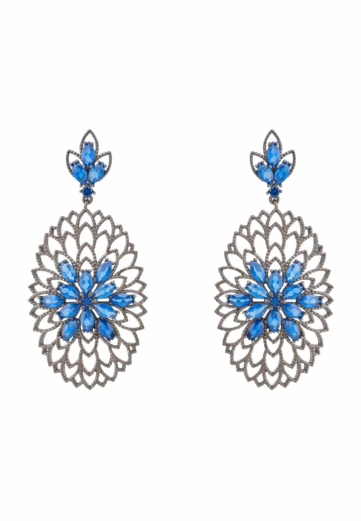 The full bloom flower earrings dazzle with sparkling cubic zirconia in the design of a flower, beautifully set at the centre of an intricate design of filigree, as fine as if spun by a spider. These oval shaped drop earrings are topped with a gemstone adorned stud post in a leaf design attached by a link to allow natural movement.