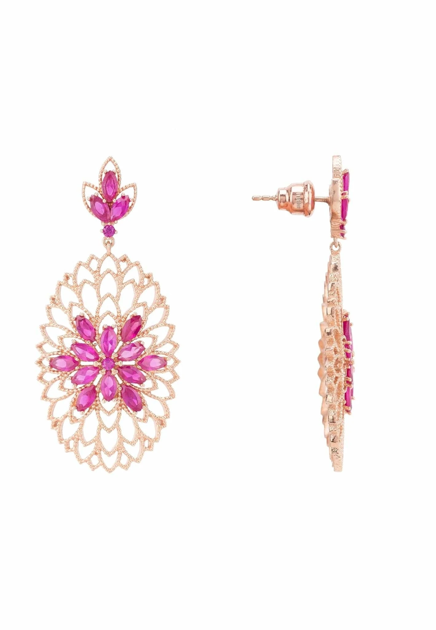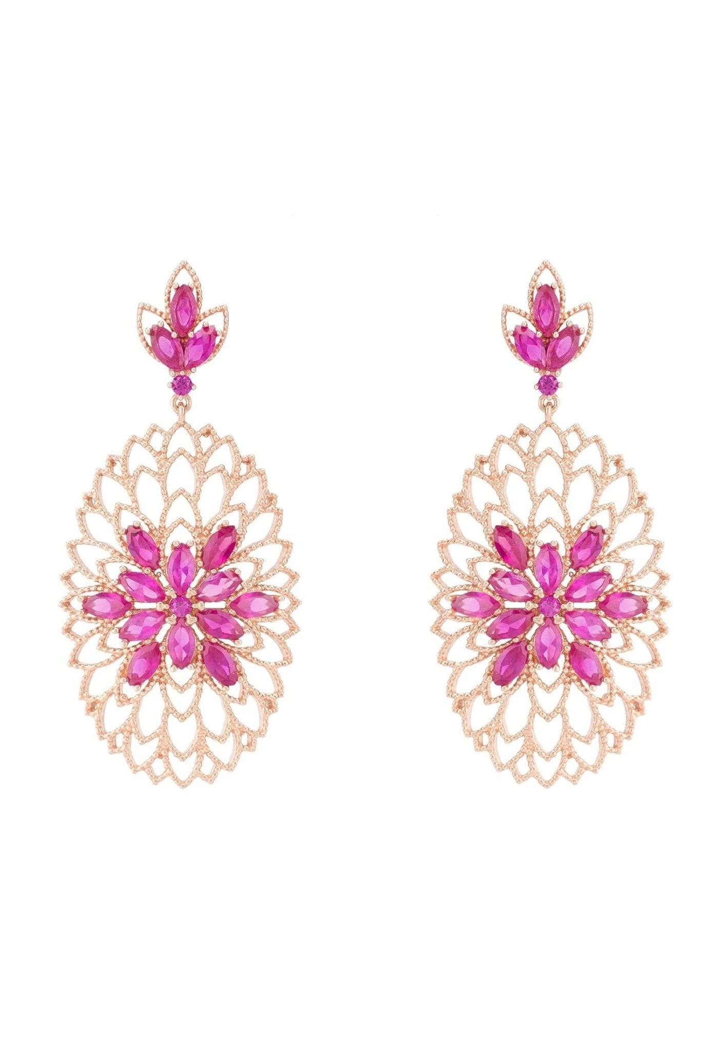TheĀ full bloom flower earrings dazzle with sparkling cubic zirconia in the design of a flower, beautifully setĀ at the centre of an intricate design of filigree, as fine as if spun by a spider. These oval shaped drop earrings are topped with a gemstone adorned stud post in a leaf design attached by a link to allow natural movement.