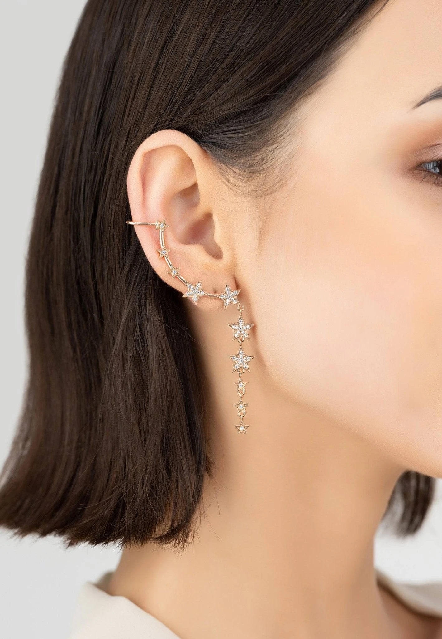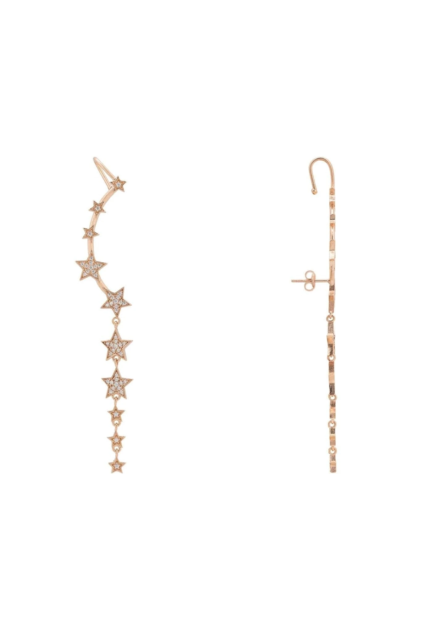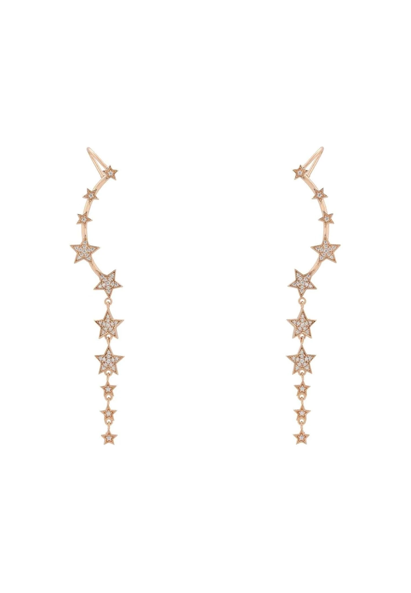 Dress your ears with these stunning statement ear climbers. The graduated star ear climbers are designed to follow up the line of the ear. These gorgeous earrings have the added flourish of a dangling drop of graduated stars, all embellished with sparkling white zircons.