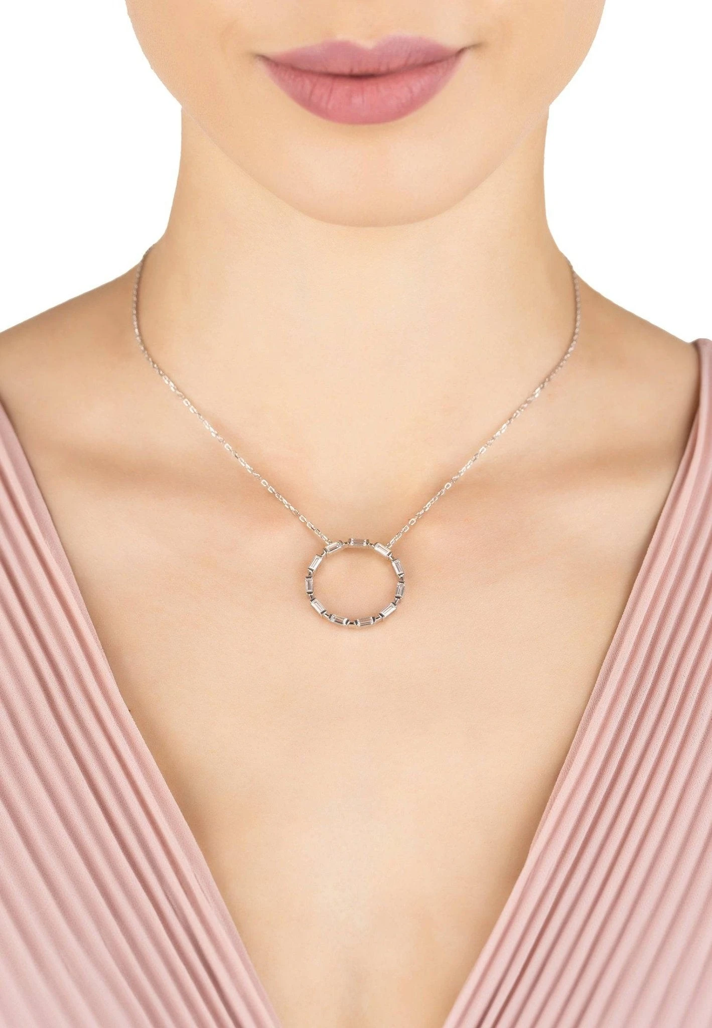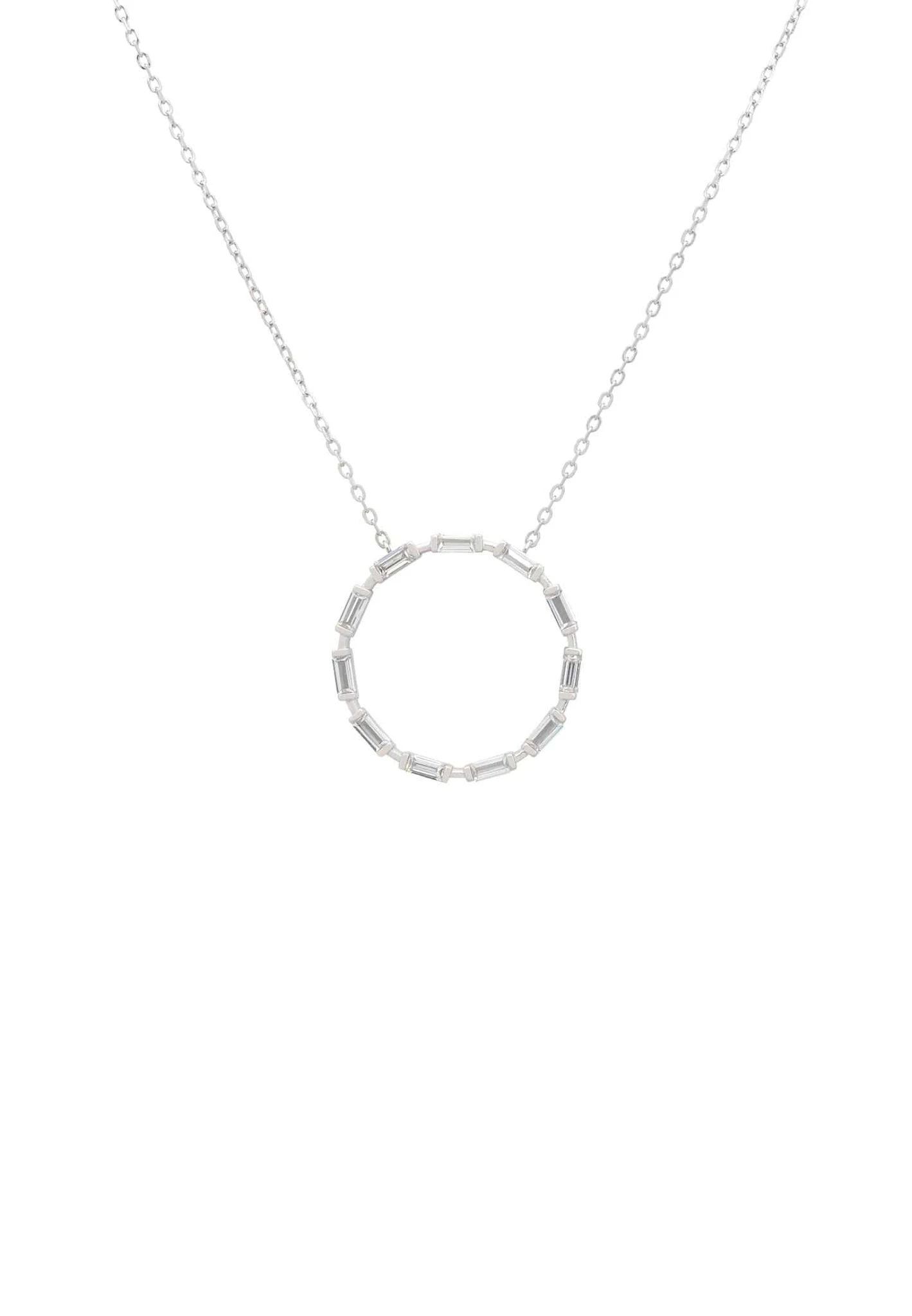 Handcrafted in sterling silver, each necklace features a halo circle edged with baguette cut zircons which provide dazzling sparkle from day to night.