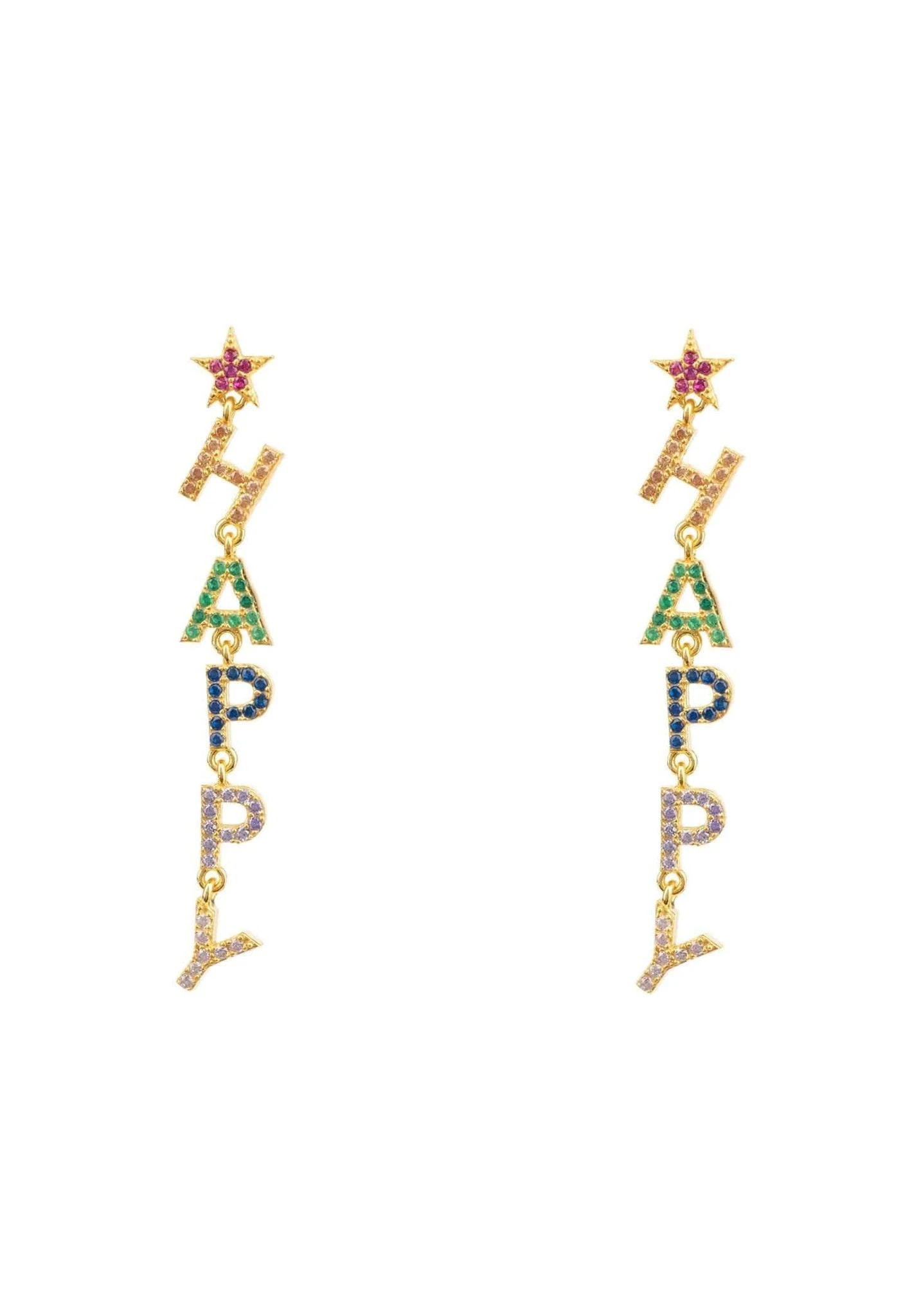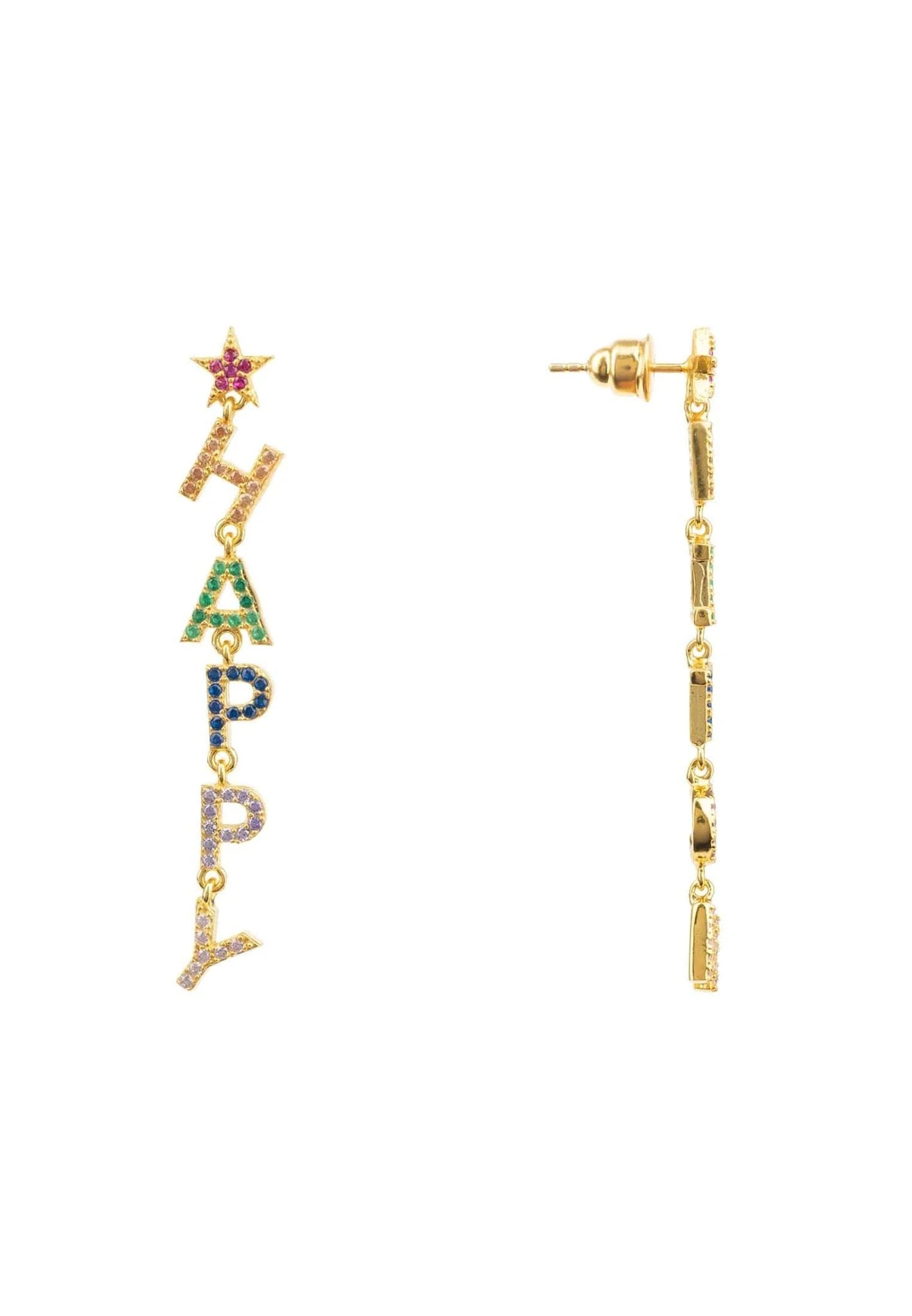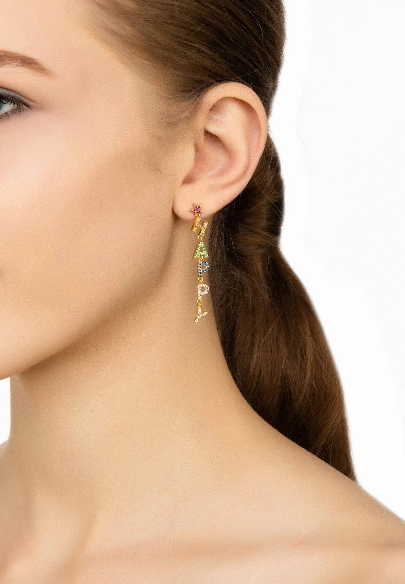 Message on these rainbow coloured drop earrings spell ‘Happy’. Each capital letter is adorned with different coloured cubic zirconias and linked together for added movement and sparkle suspended from a zircon adorned star stud.
