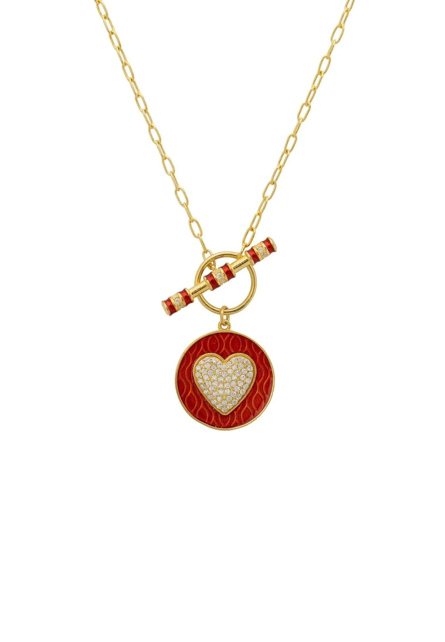 The disc shaped pendant is covered in enamel with a zircon adorned heart at its centre. This necklace has a lariat fastening. The T-bar is also embellished with red enamel and white zirconia. For added interest the reverse of this pretty necklace is also engraved with the word ‘Love’. The perfect gift for that special someone.