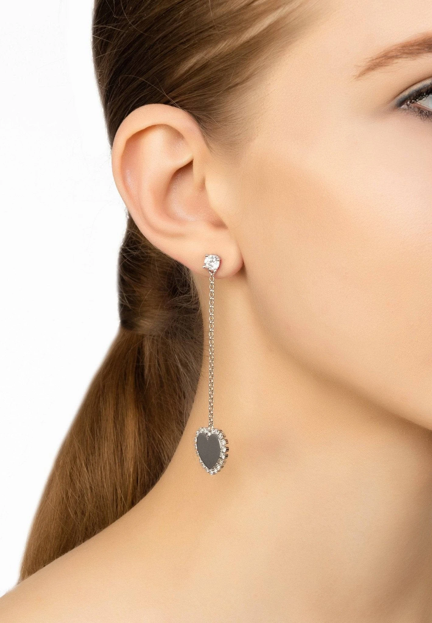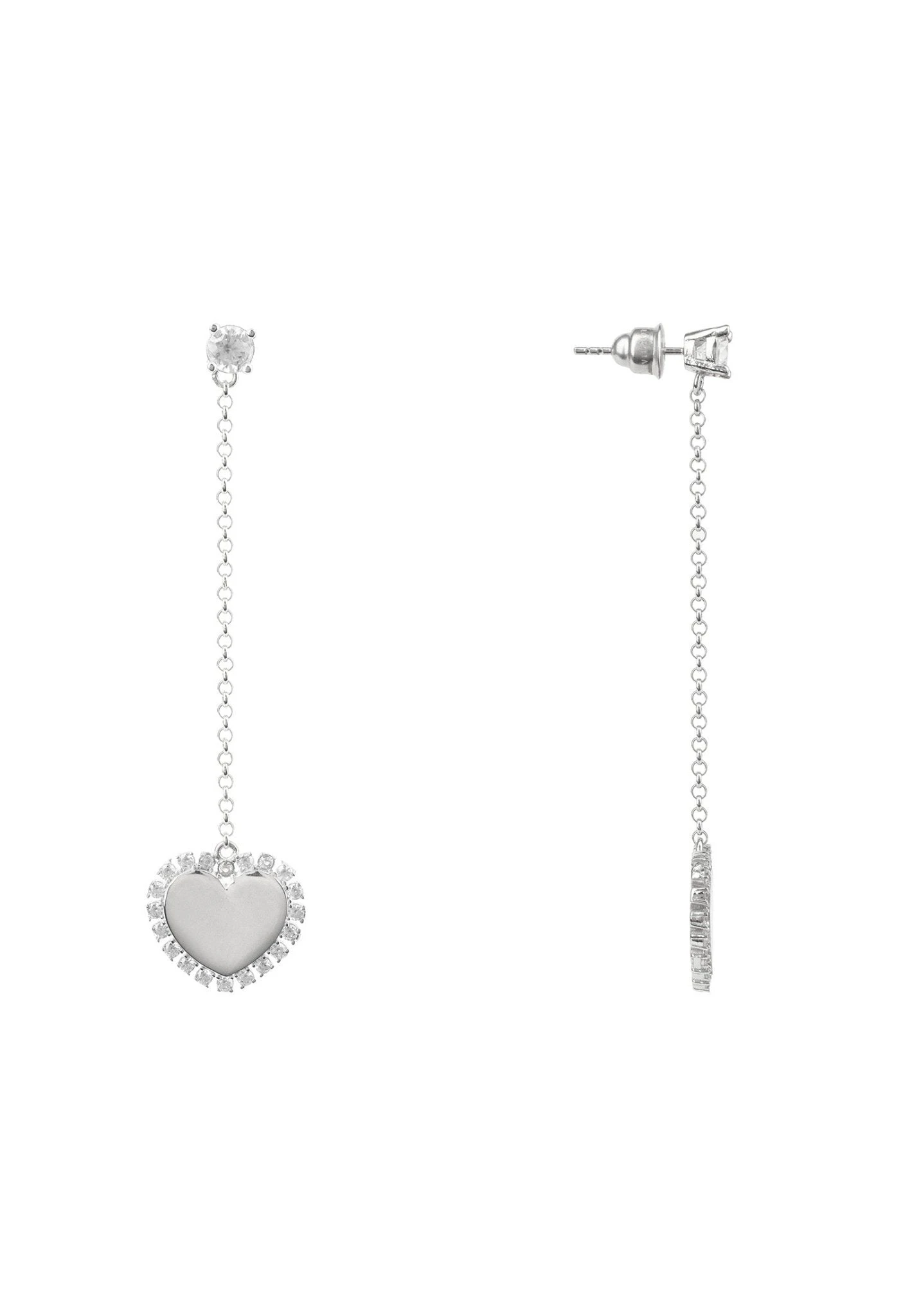 These stylish, modern earrings feature a metallic highly polished mirrored effect heart motif, bordered with white zircons, with a studded top adorned with a single zircon.