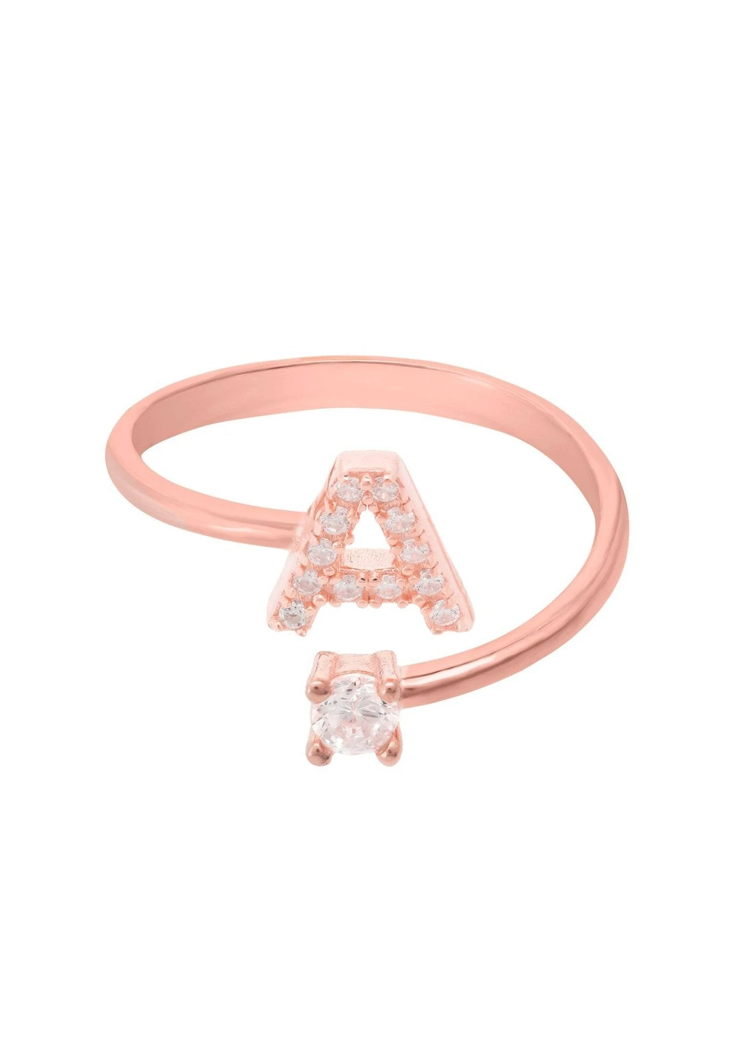 Pretty and petite, this initial ring features an open band, which allows for slight adjustability with sizing. The opening is designed to be on top of your finger, where your zircon adorned monogram is on one side and a single larger cubic zirconia resides on the other.