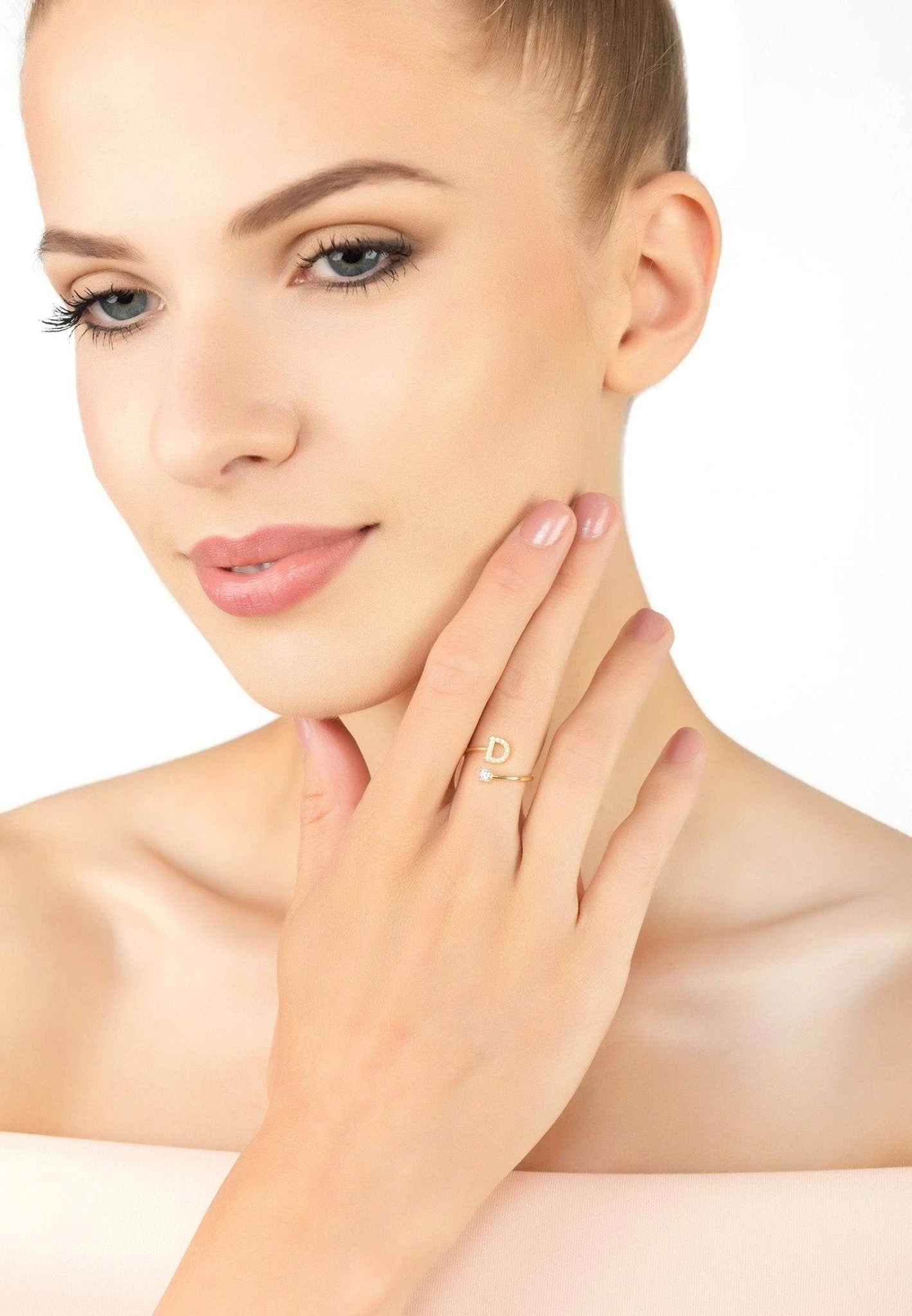 Pretty and petite, this initial ring features an open band, which allows for slight adjustability with sizing. The opening is designed to be on top of your finger, where your zircon adorned monogram is on one side and a single larger cubic zirconia resides on the other.
