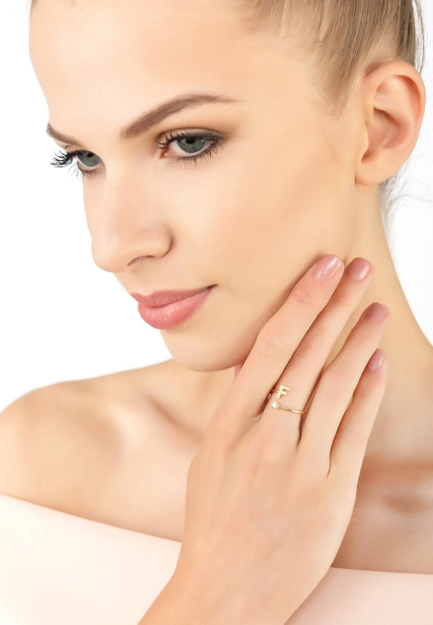 Pretty and petite, this initial ring features an open band, which allows for slight adjustability with sizing. The opening is designed to be on top of your finger, where your zircon adorned monogram is on one side and a single larger cubic zirconia resides on the other.