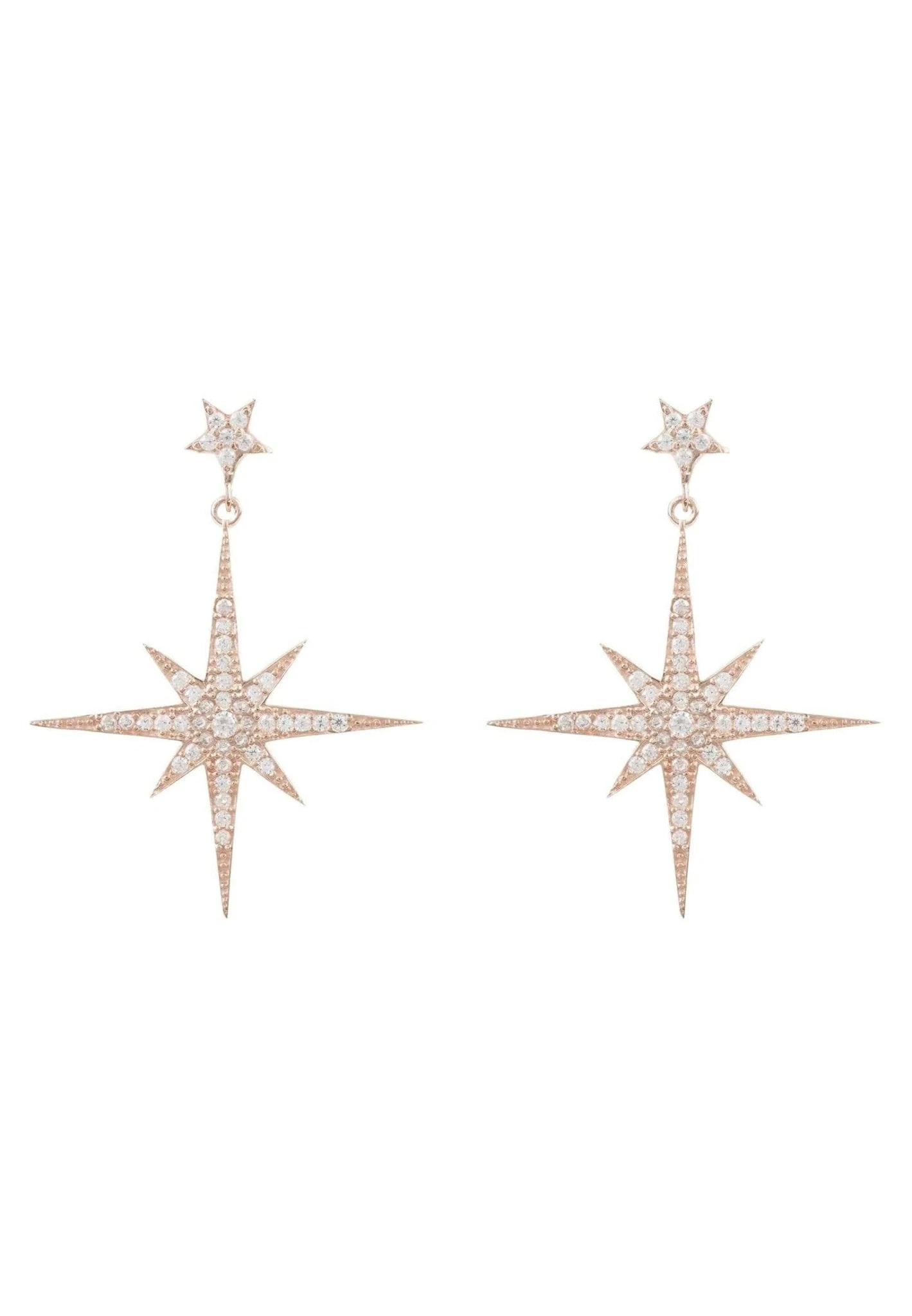 These earrings feature a large star burst that hangs from a smaller stud backed starburst, adding a touch of sparkle and sway. Made from 925 sterling silver and dipped in 22ct rose gold, these earrings are decorated with handset micro pave AAA grade white cubic zirconia for a touch of luxury. The earrings measure 4.5cm long and 3.5cm wide, and weighing only 4.6g are easy to wear.