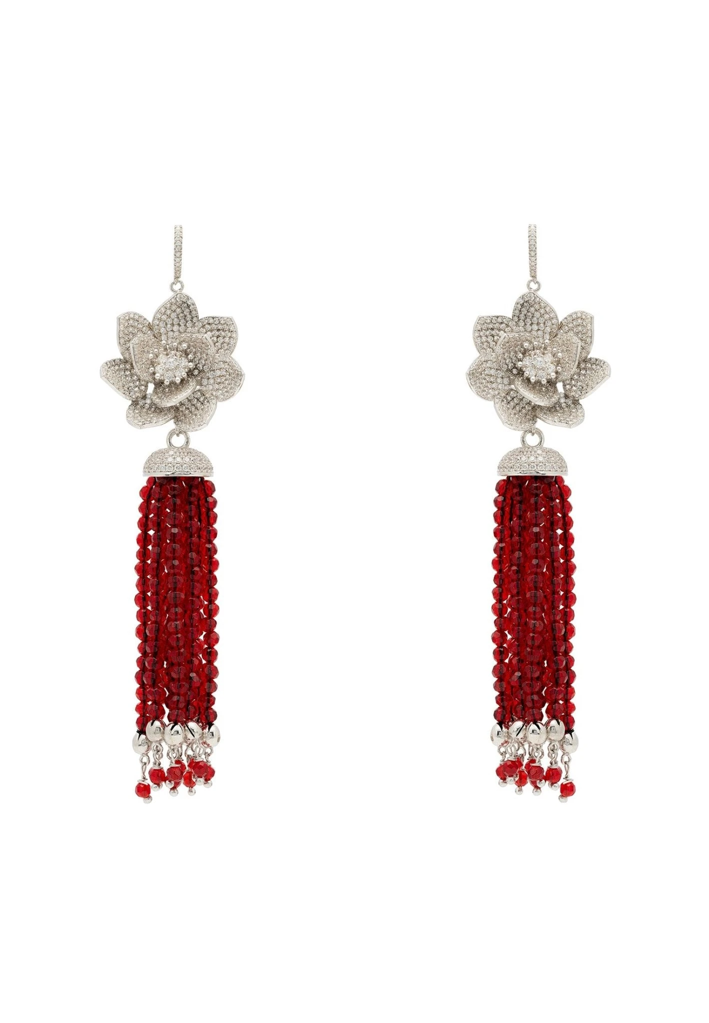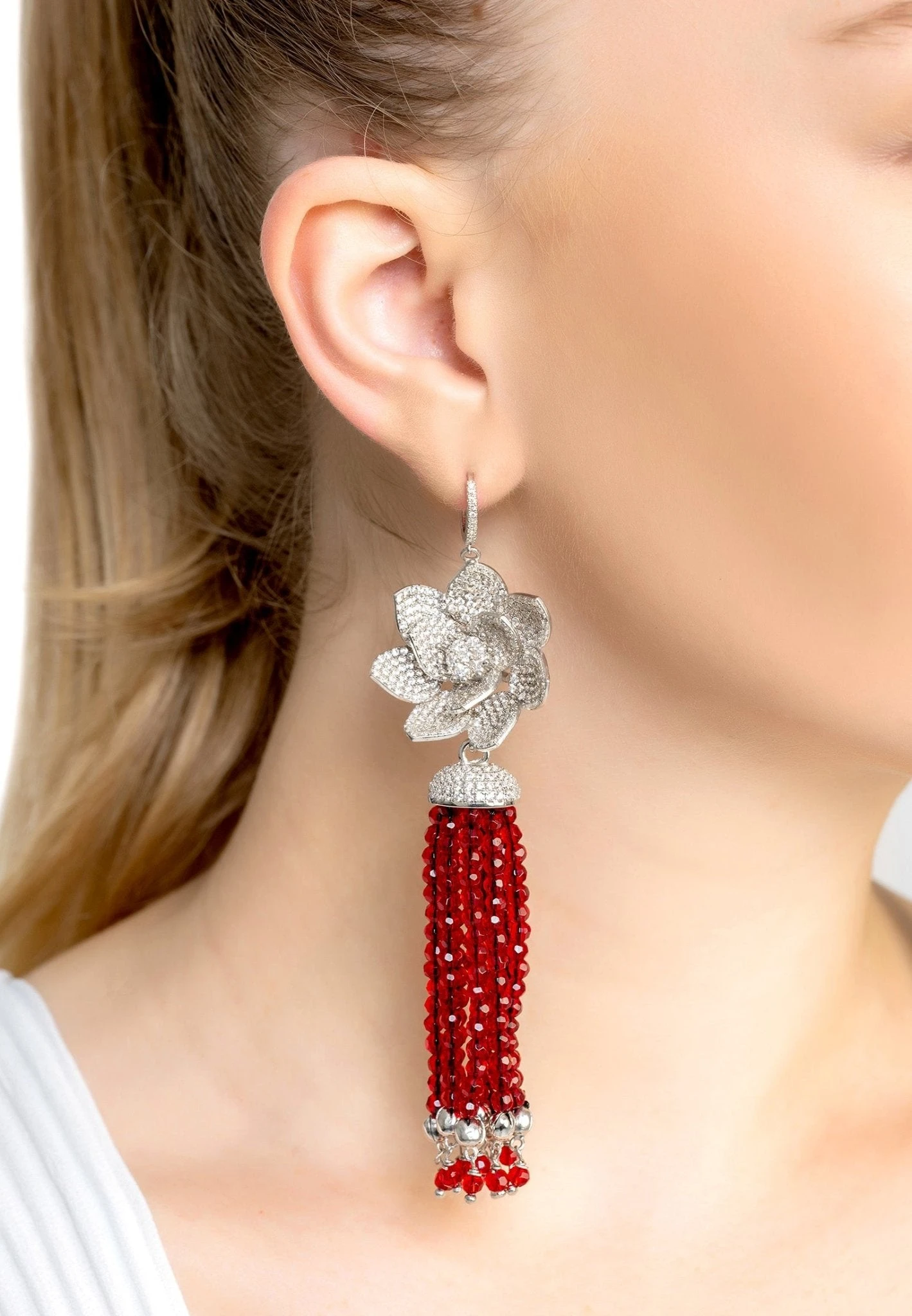 The top of these earrings are designed as a gorgeous lotus flower suspended from a small hoop fixing, with an abundance of Cubic Zirconia accents decorating the petals of this exotic flower. Add to that a delicately threaded tassel laden with lab-created Garnet gemstones, where each strand of the tassel is finished with a sparkling metallic bead, and you have some seriously fashionable statement jewellery!
