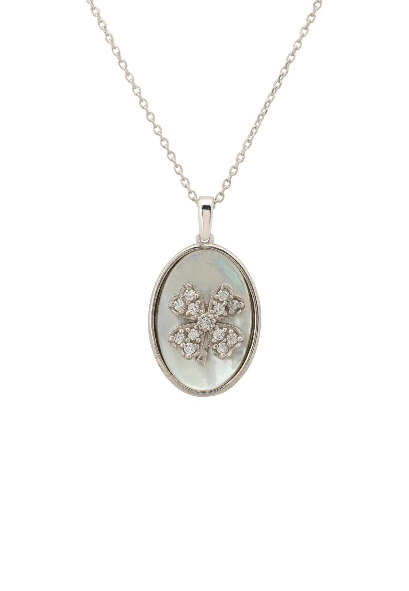 This elegant and chic natural oval white mother of pearl pendant necklace incorporates hand set zircons adorning a lucky shamrock motif design set on top of an oval shaped slice of mother of pearl.