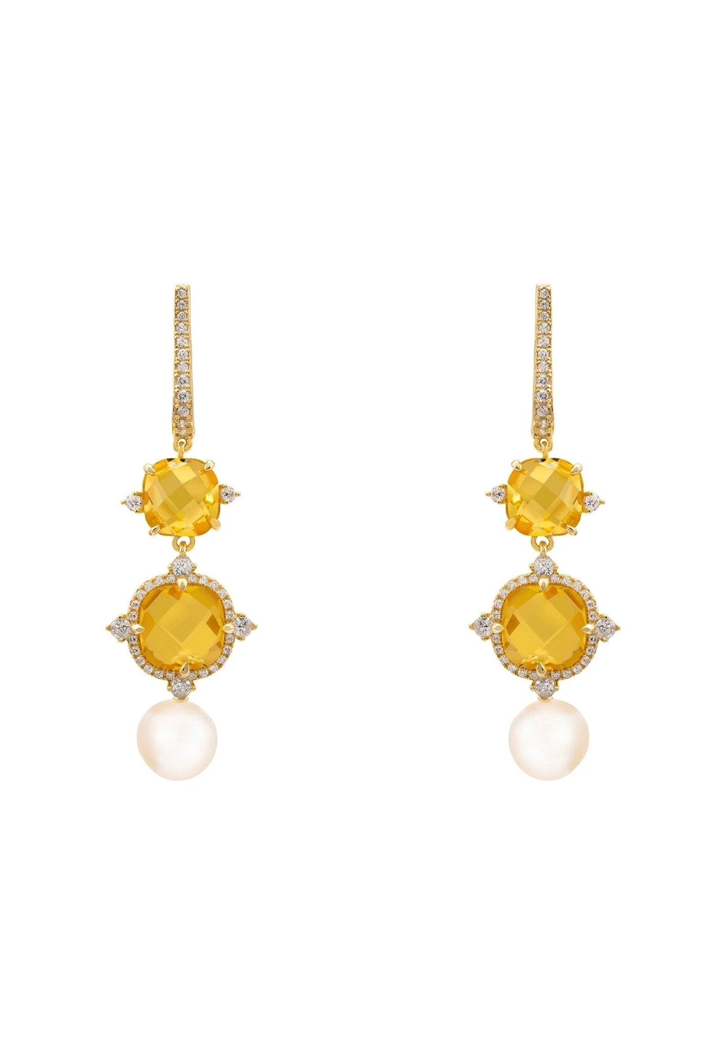 Step up your style game with the Marguerite Pearl & Citrine Earrings Gold. Make these your new go-to accessory for adding glamour and sophistication to any outfit. Handcrafted with 925 sterling silver that has been dipped in 22ct gold, these triple drop earrings feature two stunning multi-faceted Citrines and a beautiful natural pearl, all set in gleaming gold.