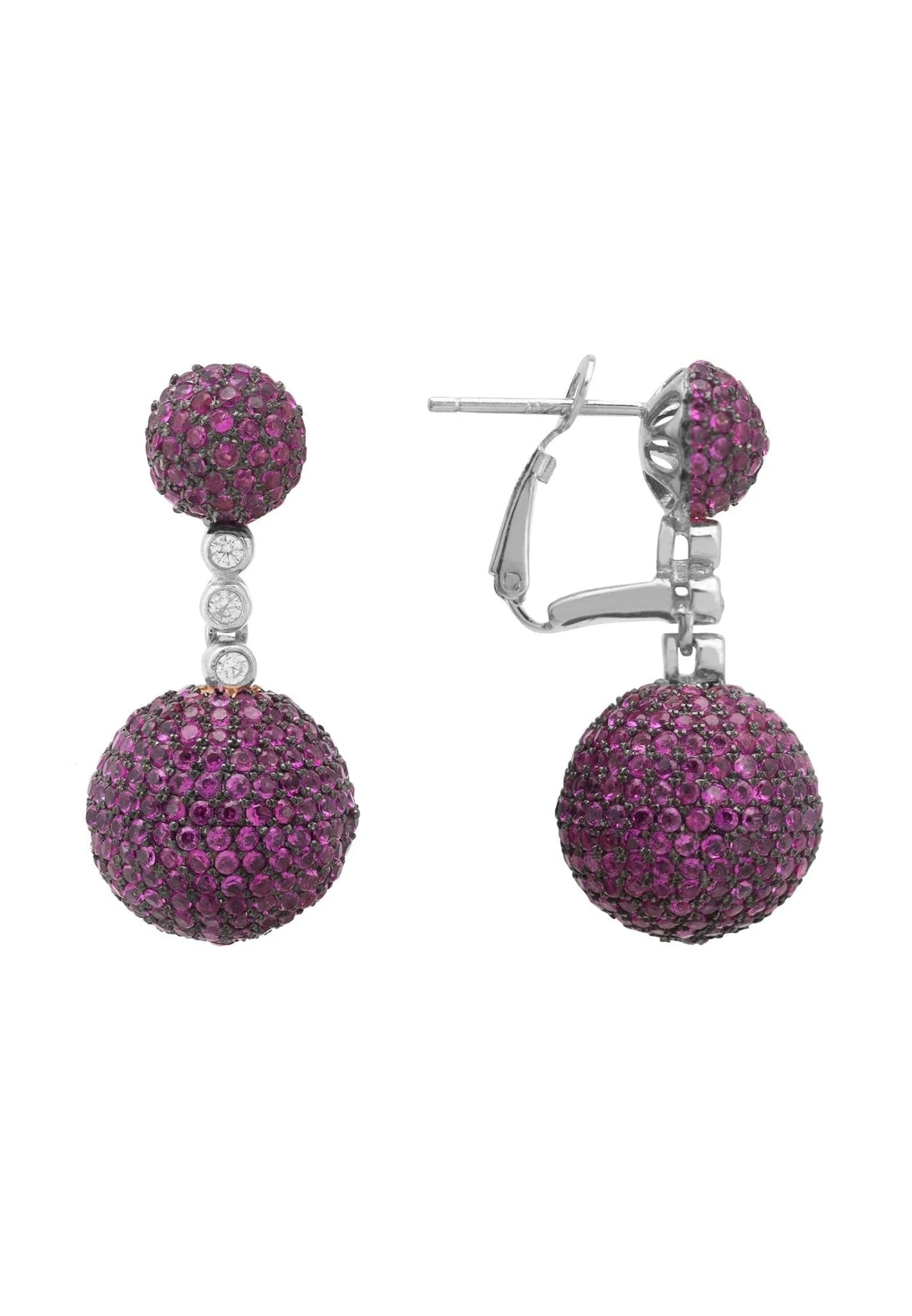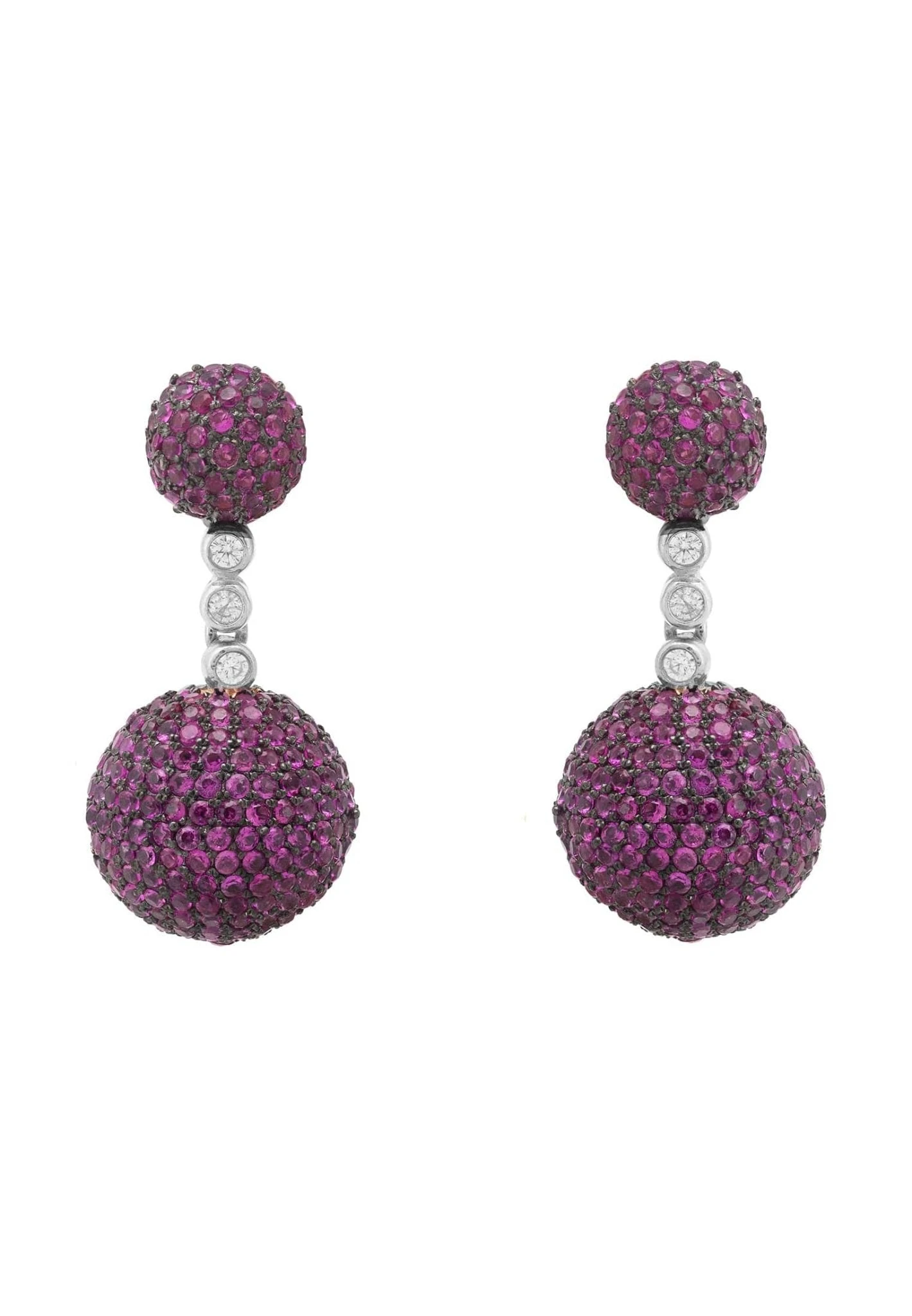 Designed as a brilliant-cut three dimensional sphere shaped drop, suspended from a smaller sphere shaped top, separated by a row of three clear white zirconia to create some movement for the wearer. These striking earrings feature a vast array of sparkling zirconia set in 925 sterling silver to add a pop of colour to any outfit.