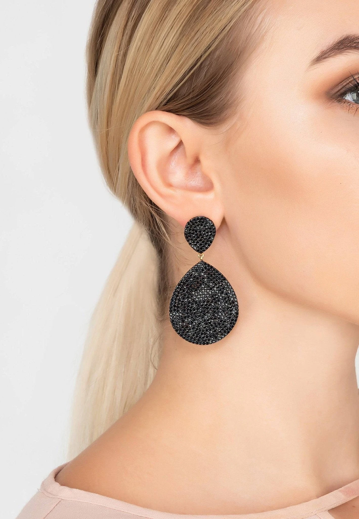The Monte Carlo earrings feature two sparkly tear drops set with hand-set black zircons. These earrings are the ideal finishing touch for any event. They will enhance the beauty of your look by providing a touch of elegance and glitz.