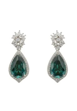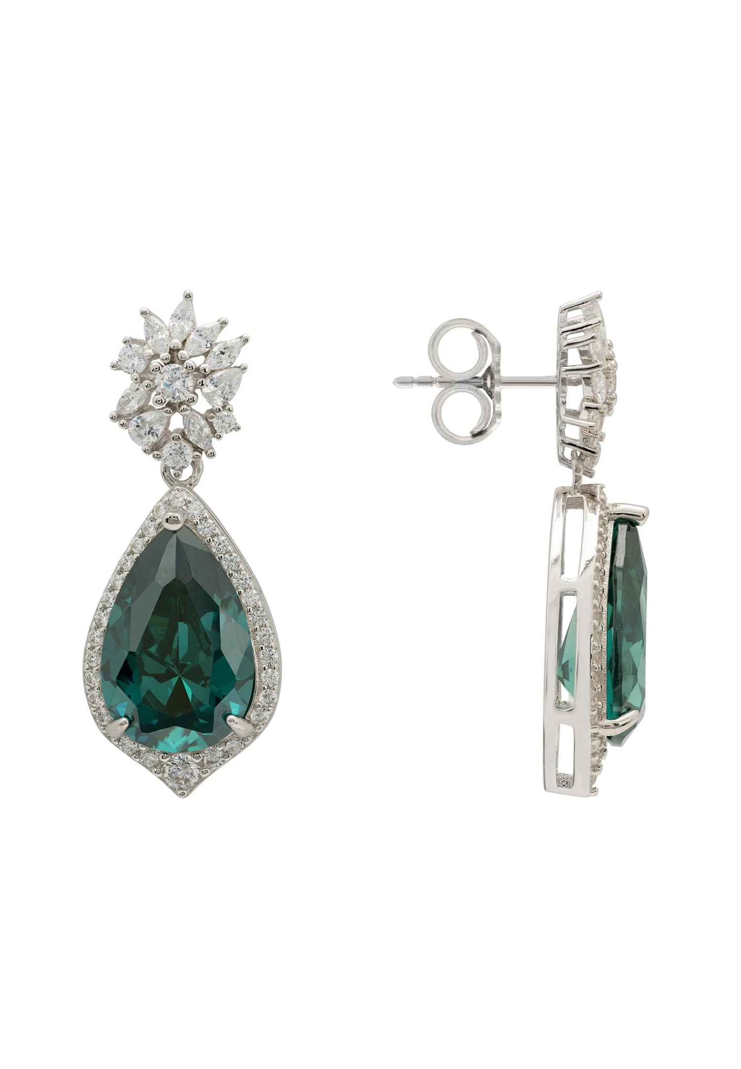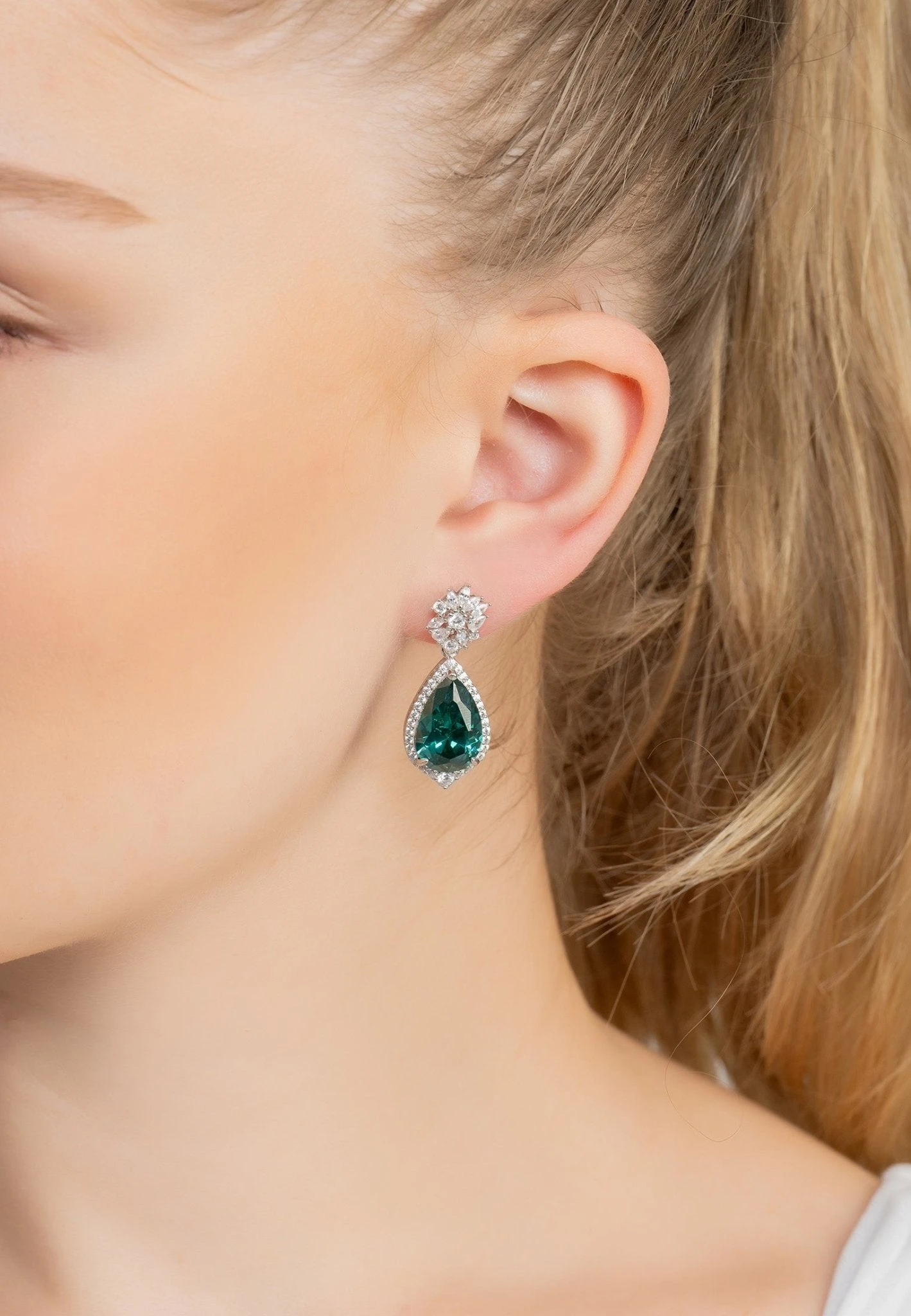 Featuring floral inspired tops adorned with stunning zirconia supports a beautiful teardrop shaped emerald green zirconia, delicately outlined in even more glistening sparkles. What a perfect way to add colour and glamour to your outfit.