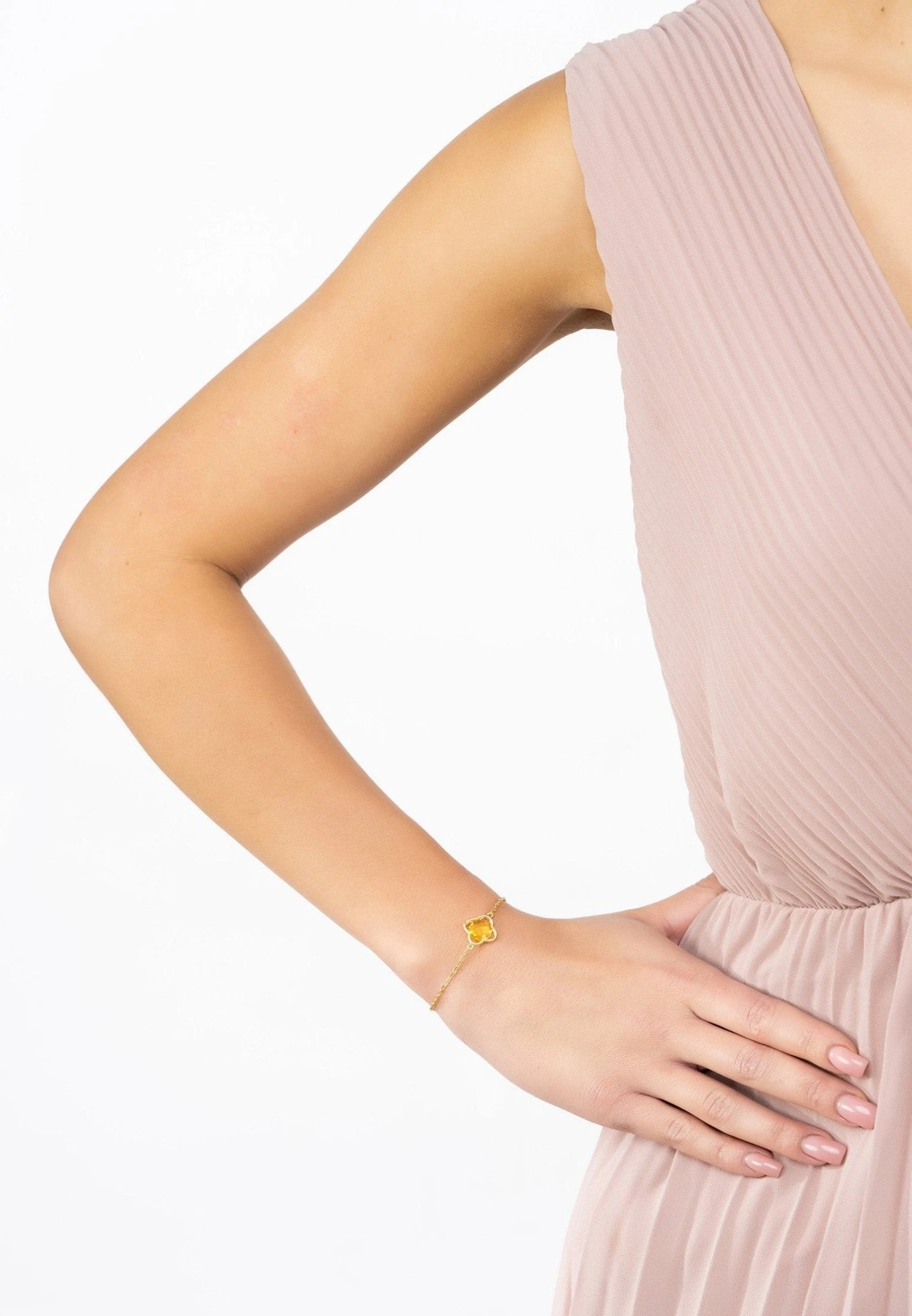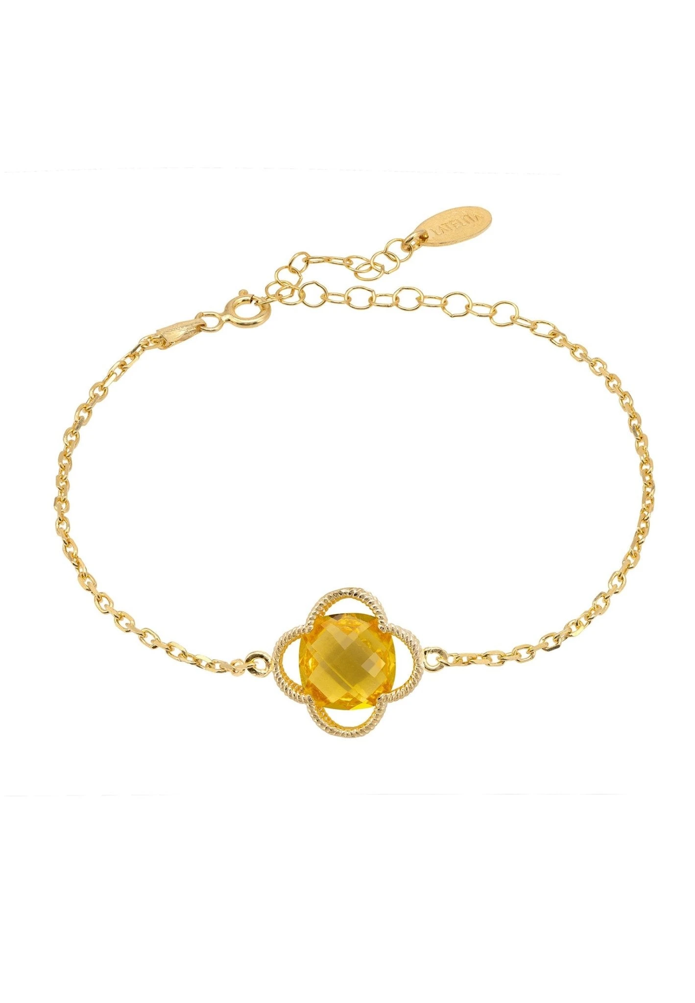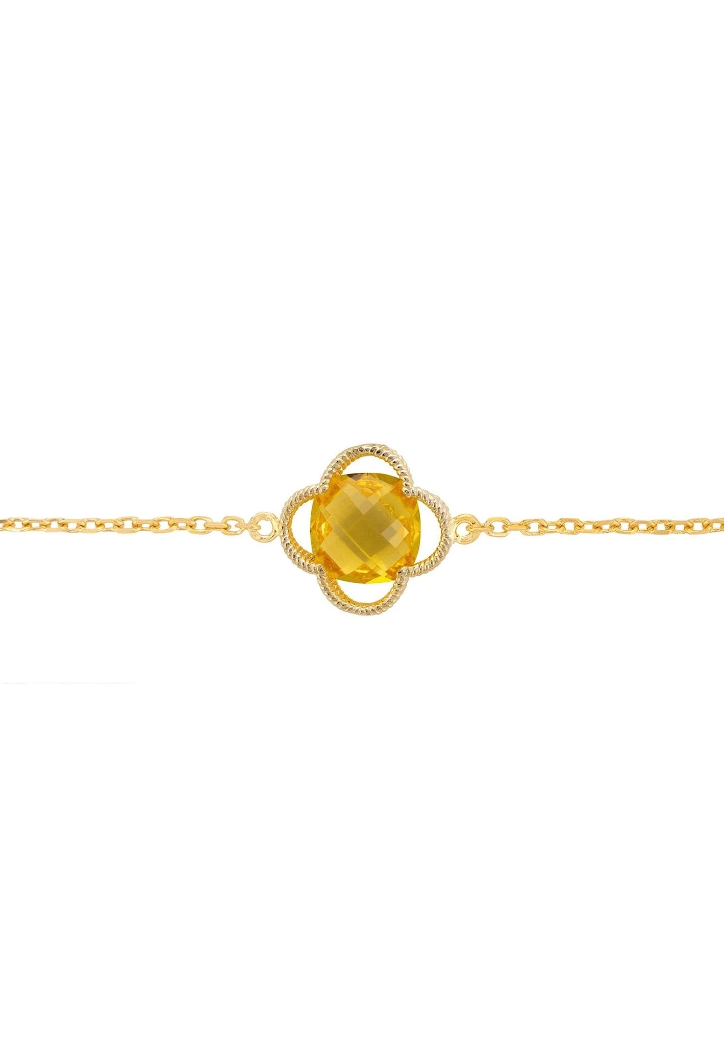 Introducing the Open Clover Flower Gemstone Bracelet, a beautiful and stylish way to accessorize any outfit! This bracelet is handcrafted in 925 sterling silver, dipped in 22ct gold and features a textured metallic open clover setting, with a vibrant yellow Citrine gemstone at its centre, set on a fine chain.