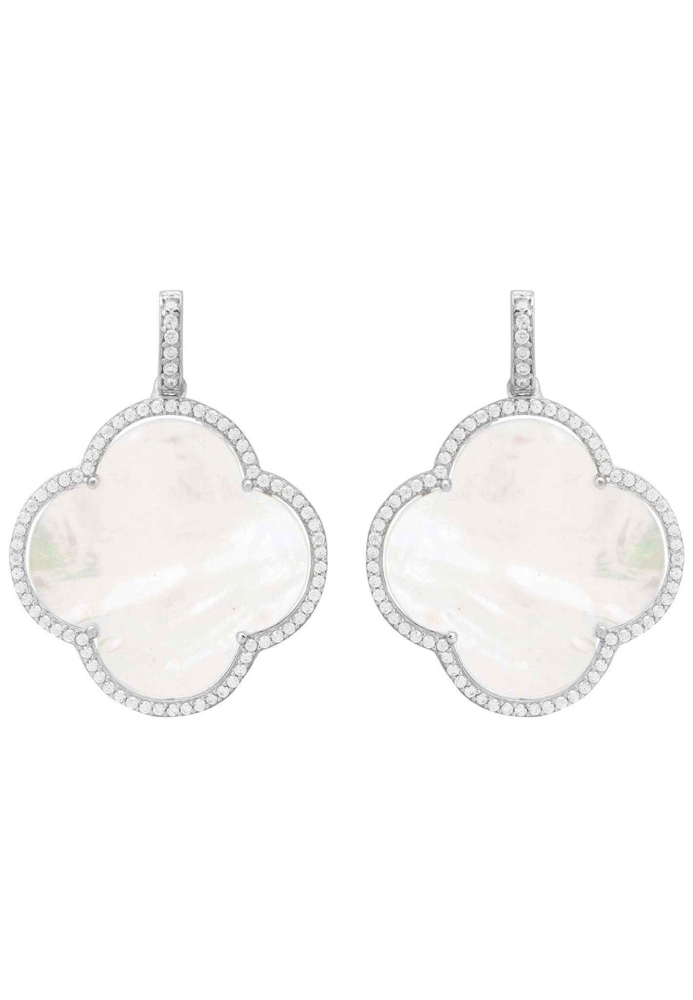 These large drop chandelier earrings have a simple geometric design, hand set with Latelita signature sparkles outlining a clover shaped slice of white mother of pearl, catching the light and dazzling as they move with the wearer.