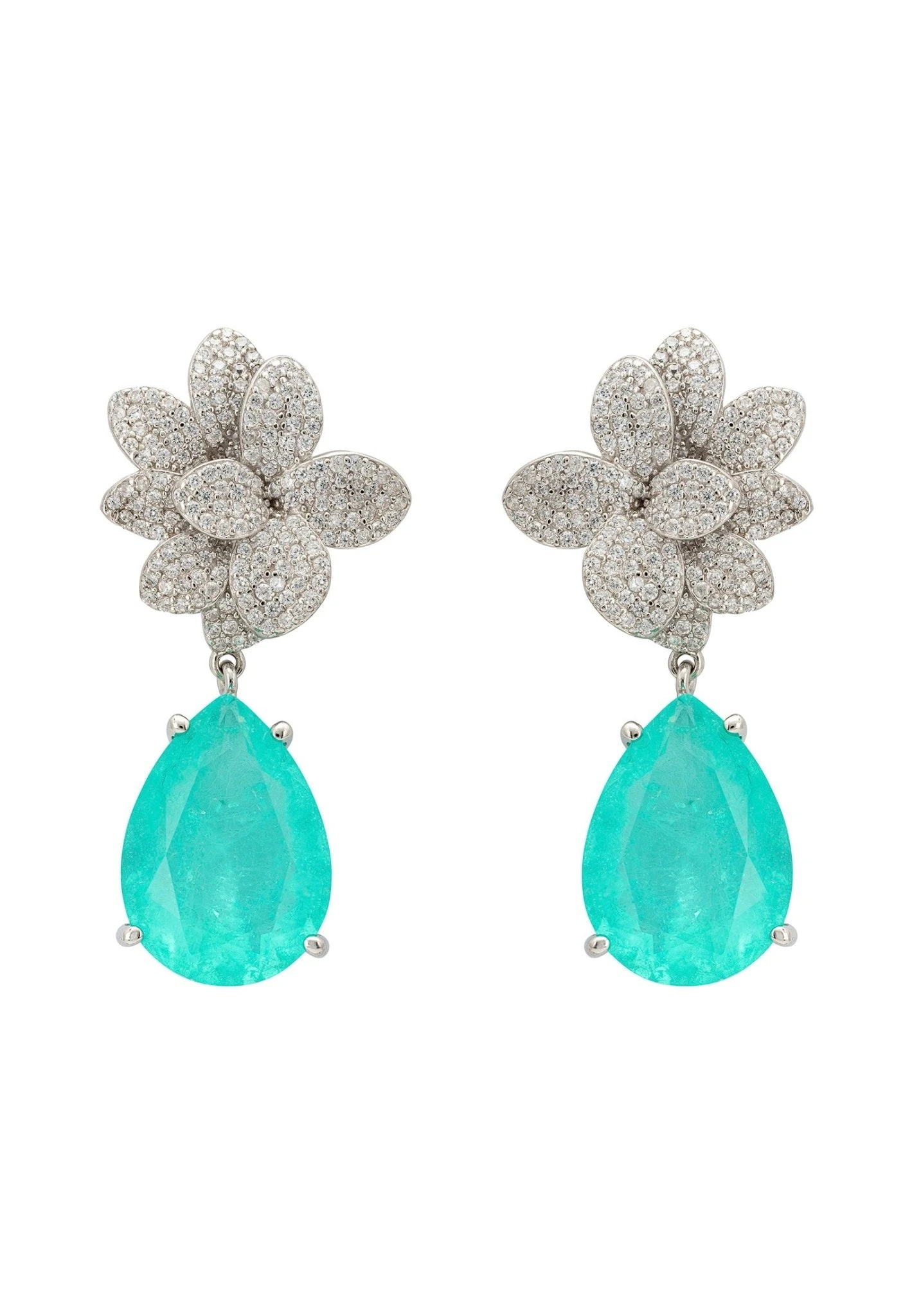 The floral design at the top is meticulously adorned with cubic zirconia, capturing the delicate beauty of an orchid. Below, a teardrop-shaped Paraiba tourmaline gemstone dangles gracefully. Set in a deep open silver setting, the vibrant lab-created gemstone captures light from every angle, showcasing its unique colour.