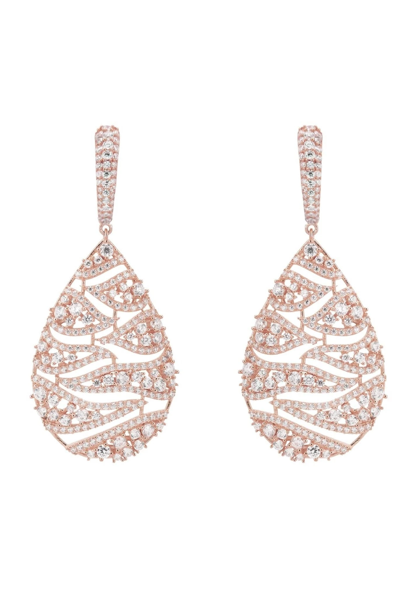 These dangling drop earrings feature a slightly bevelled open patterned teardrop, suspended from a zircon adorned creole top, which allows for natural movement for the wearer.
