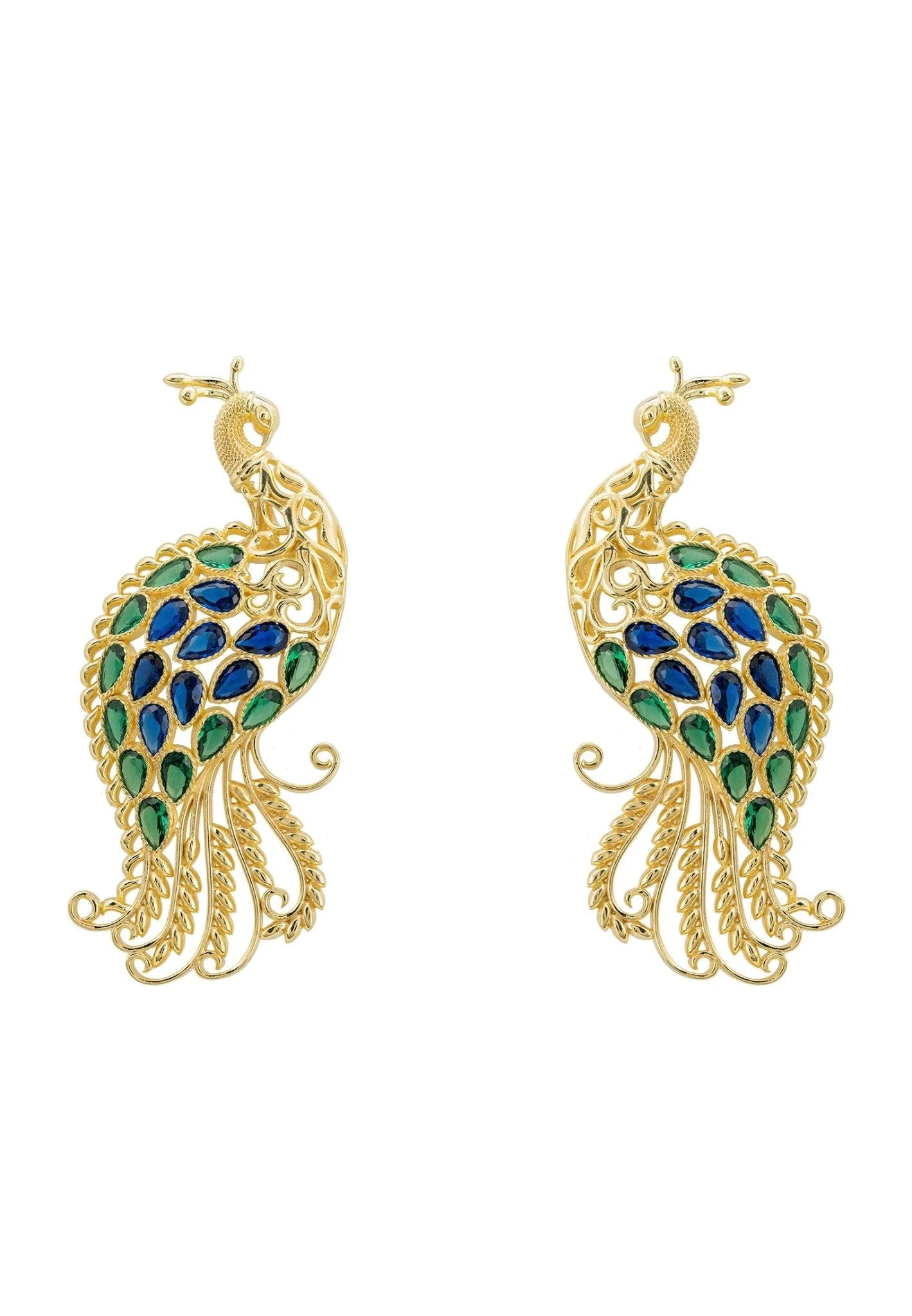 Behold the beauty of our Peacock Train Earrings. These unique and stylish earrings are handcrafted in 925 sterling silver, dipped in 22ct gold then adorned with beautiful green and blue teardrops of zirconia, creating an eye-catching piece that will have all your friends talking.