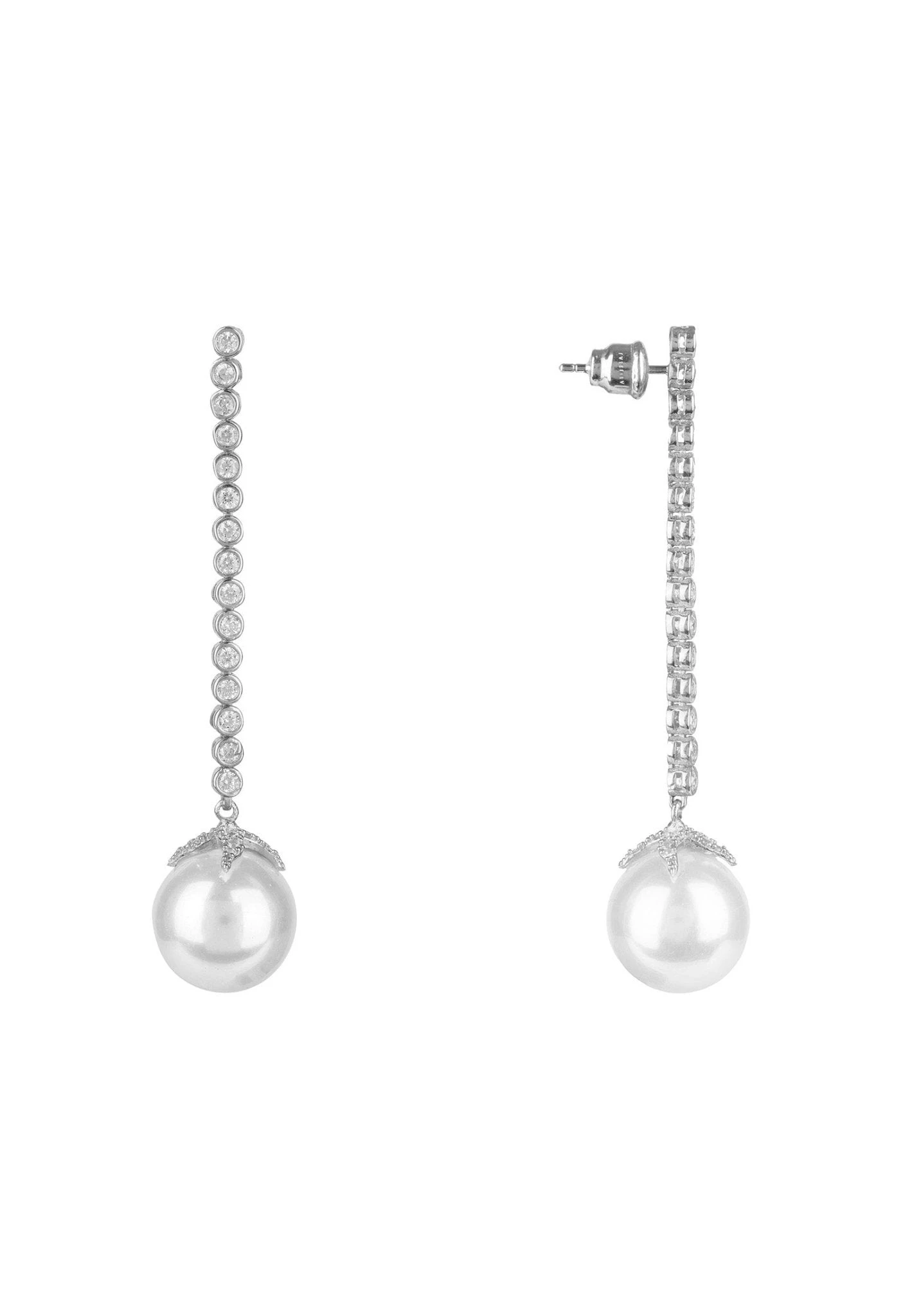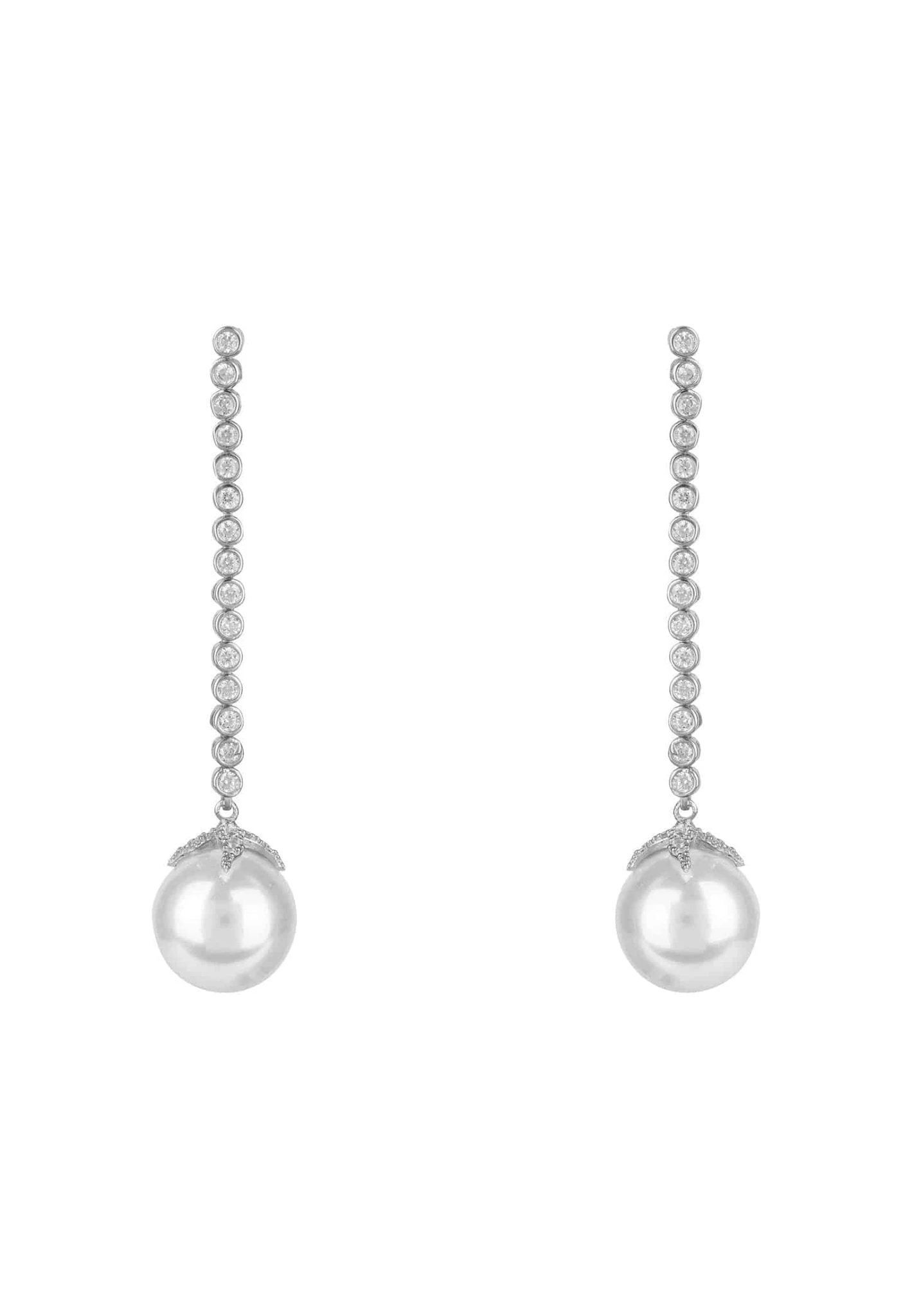 Formed of a long drop with a suspended majorica pearl, these sleek and contemporary pearl earrings are adorned along the drop of this earring with zirconia accents which allows for extra movement and added sparkle as they catch the light.