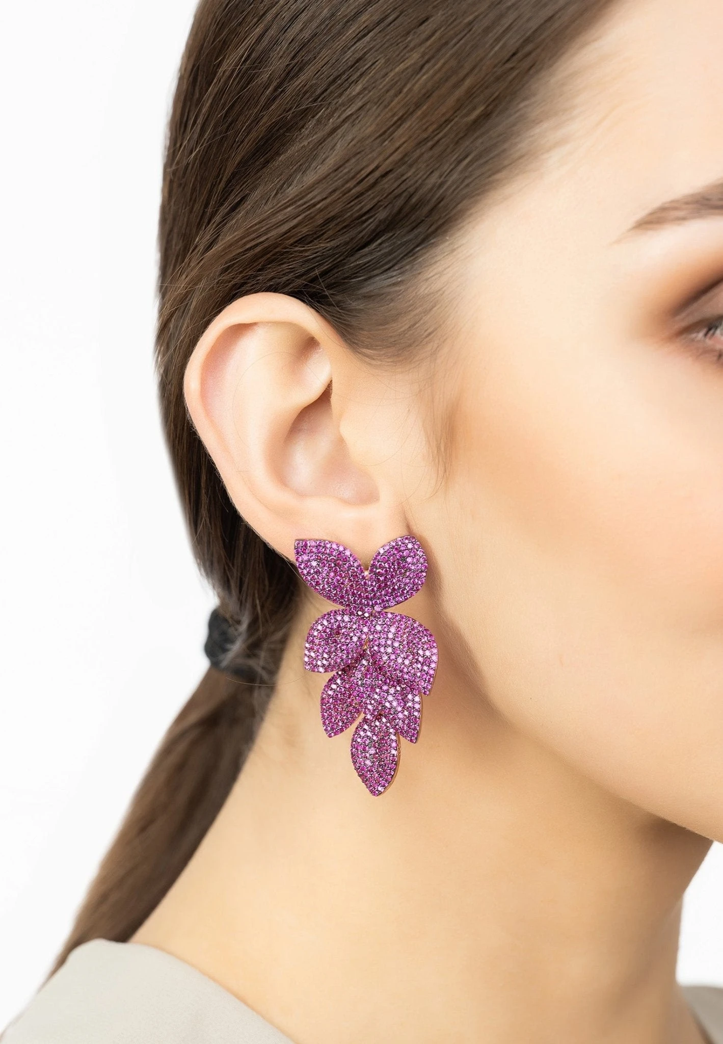 With these gorgeous Petal Cascading Flower Earrings, you’ll turn heads everywhere you go. With eight linked zircon adorned petals cascading down from the ear, these floral inspired earrings are guaranteed to grab attention. There is a link beneath the first two petals, that also form the stud top, to allow for natural movement while wearing. They are 5.5cm in length and 3cm wide and made from 925 sterling silver that has been dipped in 22ct luxurious rose gold, handset with micro pave ruby cubic zirconia to add a gorgeous pop of colour to your ensemble.