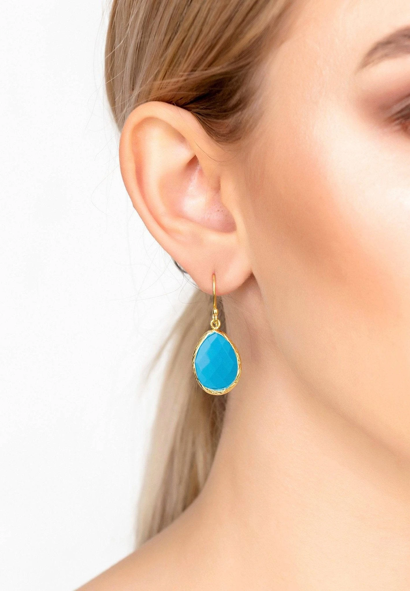 As if carved from the azure heaven and slipped to earth, the turquoise petite drop earring bring back memories of those summer blue skies and crystal clear waters of the Mediterranean sea . The teardrop shaped faceted blue topaz stones are set in 925 silver and dipped in 22ct gold and dangle from French hooks. The delicate veining or mottled webbing is unique to each earring and serves to enhance its character.