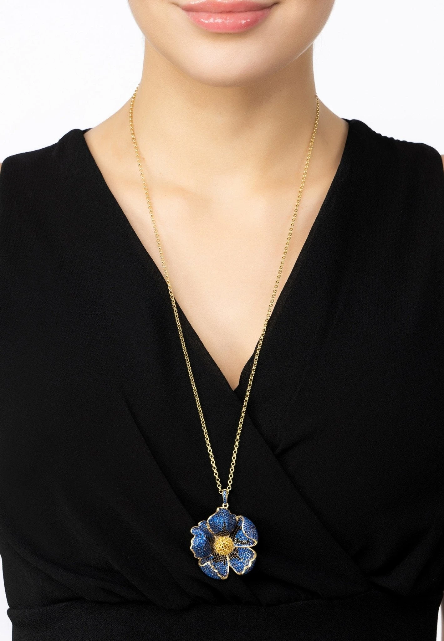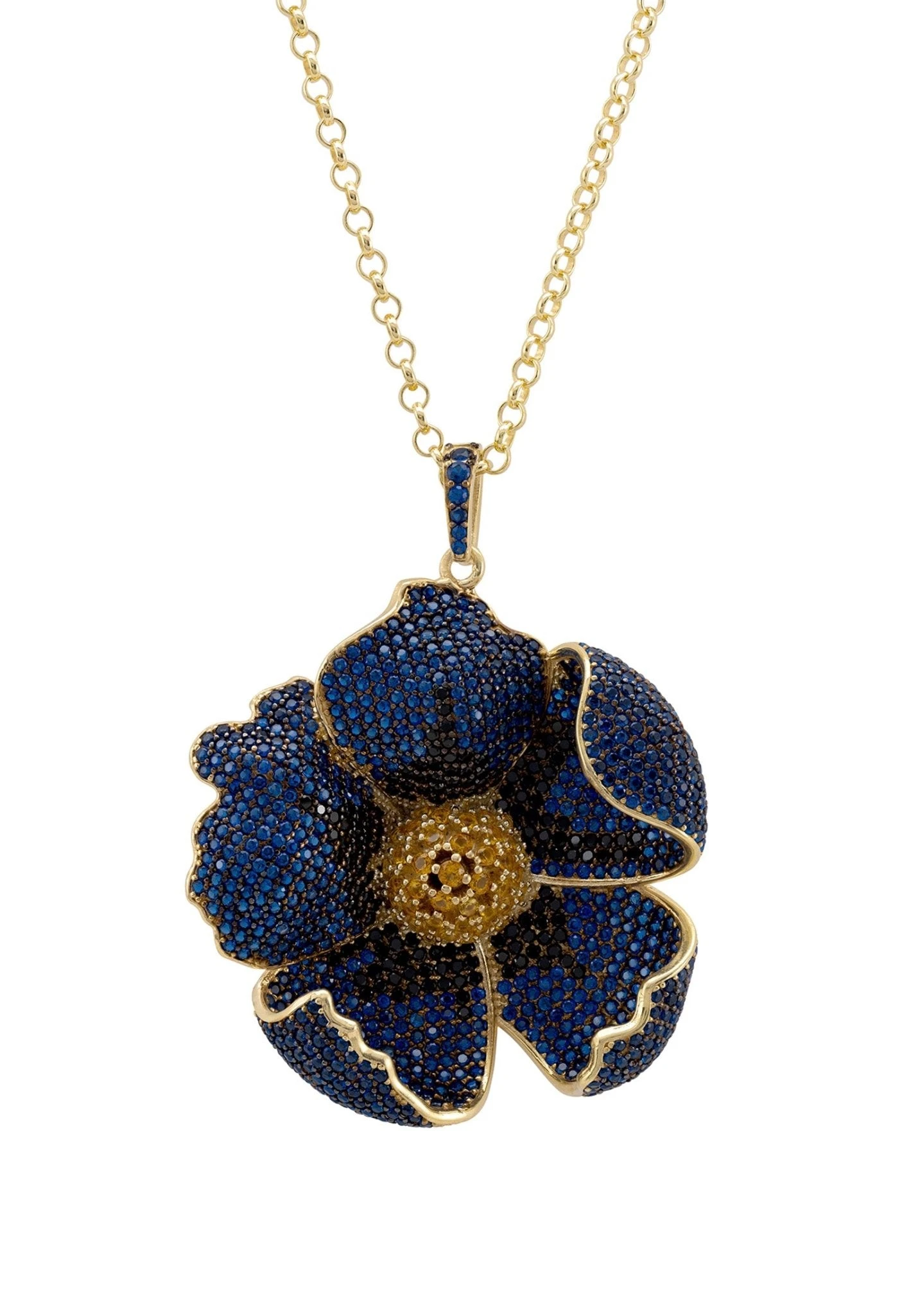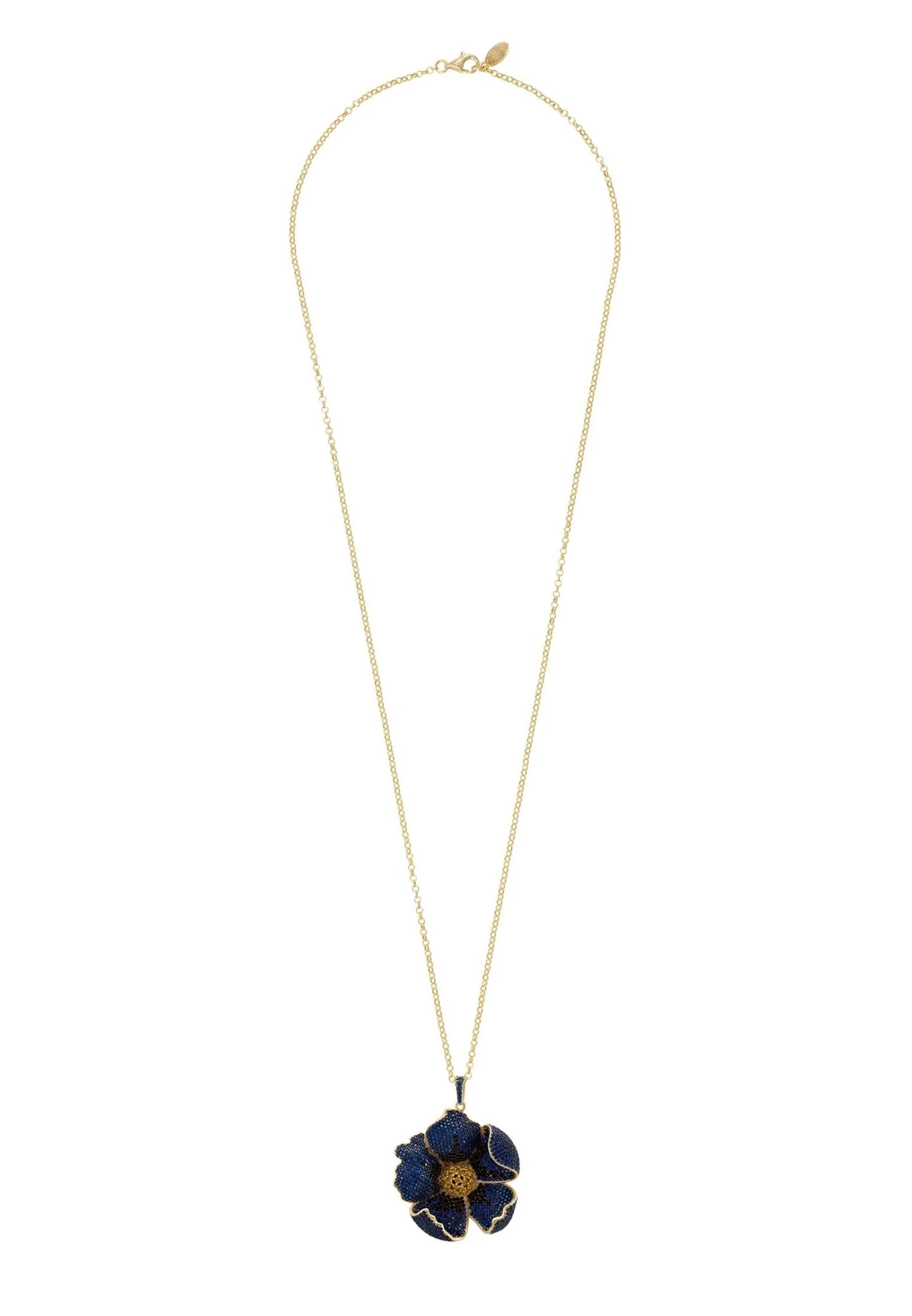 Enhance any outfit with this sophisticated and stunning poppy pendant necklace! Handcrafted in 925 sterling silver dipped in luxurious gold, it features intricate detailing, including sapphire blue and black cubic zirconia on each petal of the three-dimensional poppy design and brilliant yellow zircon in the centre. The poppy pendant measures 3.5 x 4 cm and with a weight of 21.2grams and a lengthy 68cm chain, this pendant creates an unforgettable statement without ever feeling too heavy or bulky on your neck.