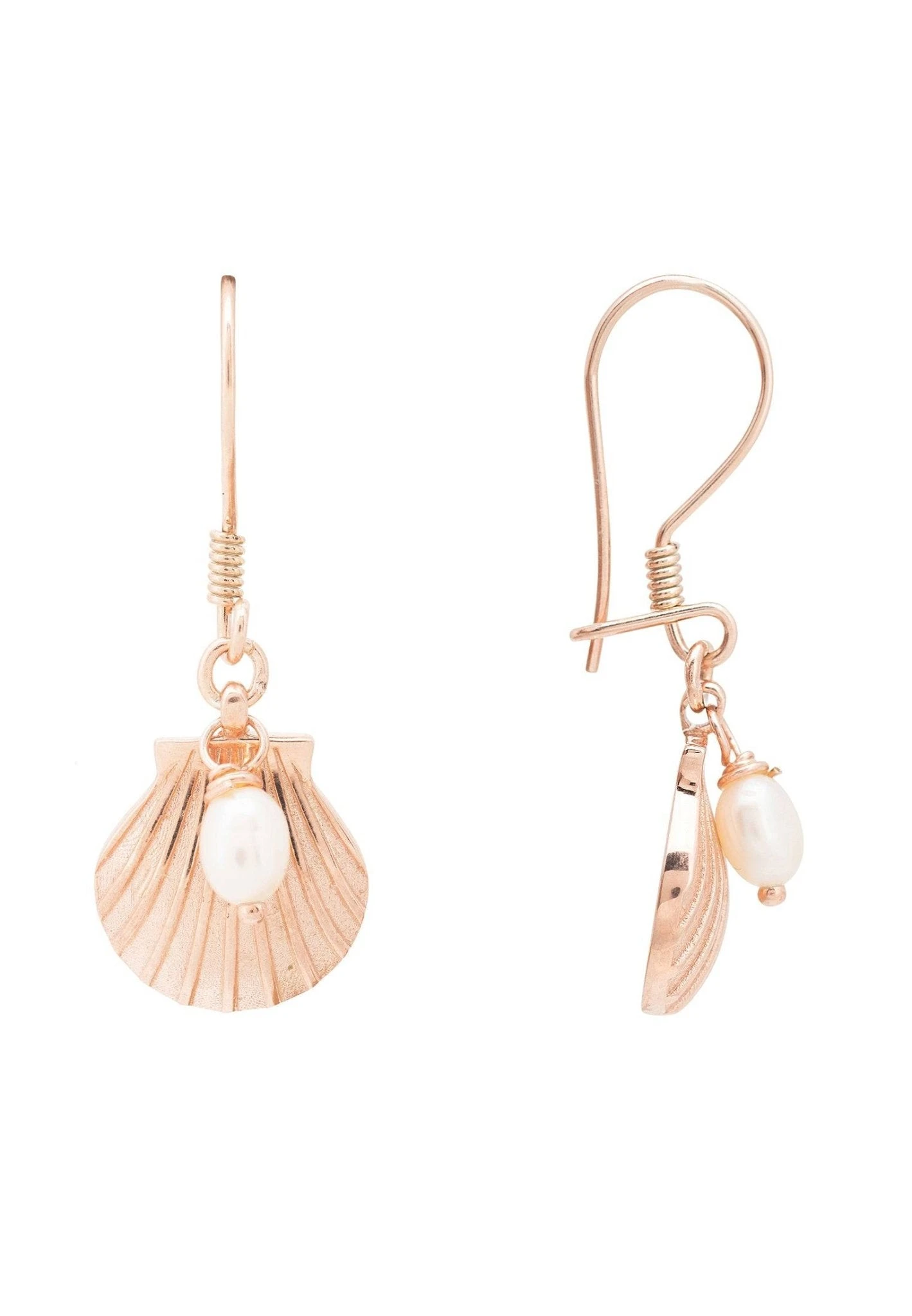 These delicate earrings have a beautifully cast scallop shell motif with a small pearl attached at the top. An essential for those that covet delicate jewellery. These ribbed fan-shaped shell drop earrings have the versatility to be worn with a simple cashmere sweater, or with a little black dress..